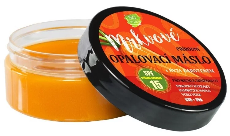 Přírodní mrkvové máslo pro dlouhodobé opálení s vysokým obsahem mrkvového extraktu, beta karotenu a přírodních olejů, chrání pokožku a zabraňuje jejímu stárnutí. Dopřejte své pokožce zdravé, bronzové opálení bez parabenů, umělých barviv a konzervantů. Voděodolné, podporuje zlatavou barvu pokožky. Při nanesení na pokožku se máslo mění v olej a tím se velmi snadno roztírá.