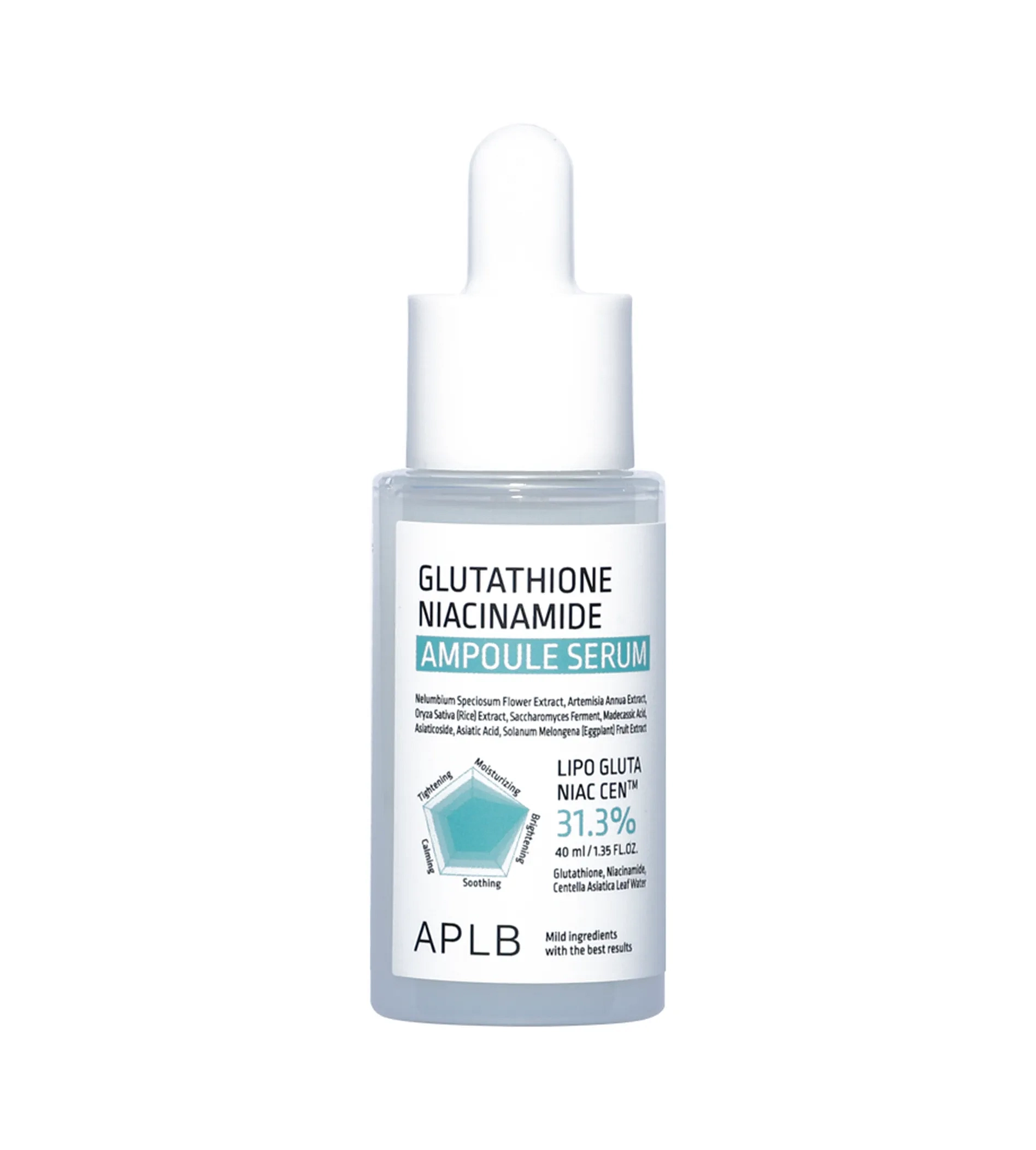 APLB Glutathione Niacinamide Ampoule Serum je koncentrované ampulové sérum navržené pro rozjasnění, sjednocení tónu pleti a intenzivní hydrataci. Díky kombinaci glutathionu a niacinamidu pomáhá redukovat pigmentové skvrny, zlepšuje pružnost pokožky a zanechává pleť viditelně svěží a zdravě rozzářenou.