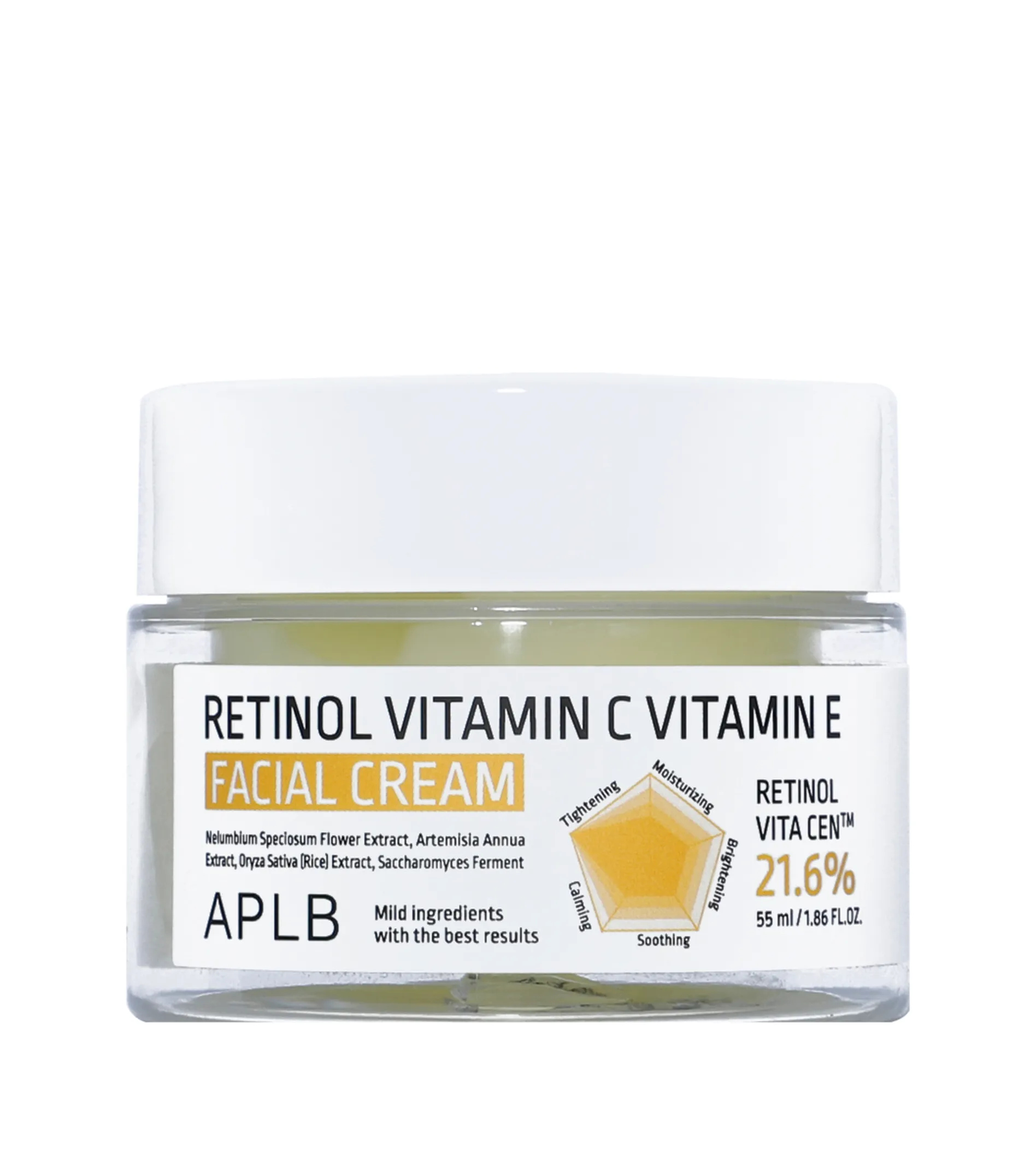 APLB Retinol Vitamin C Vitamin E Facial Cream je výživný pleťový krém navržený pro komplexní anti-age péči, který pomáhá redukovat jemné linky a vrásky, zlepšuje strukturu pleti a sjednocuje její tón. Díky kombinaci retinolu, vitamínu C a vitamínu E poskytuje intenzivní hydrataci a zároveň chrání pleť před vnějšími vlivy.