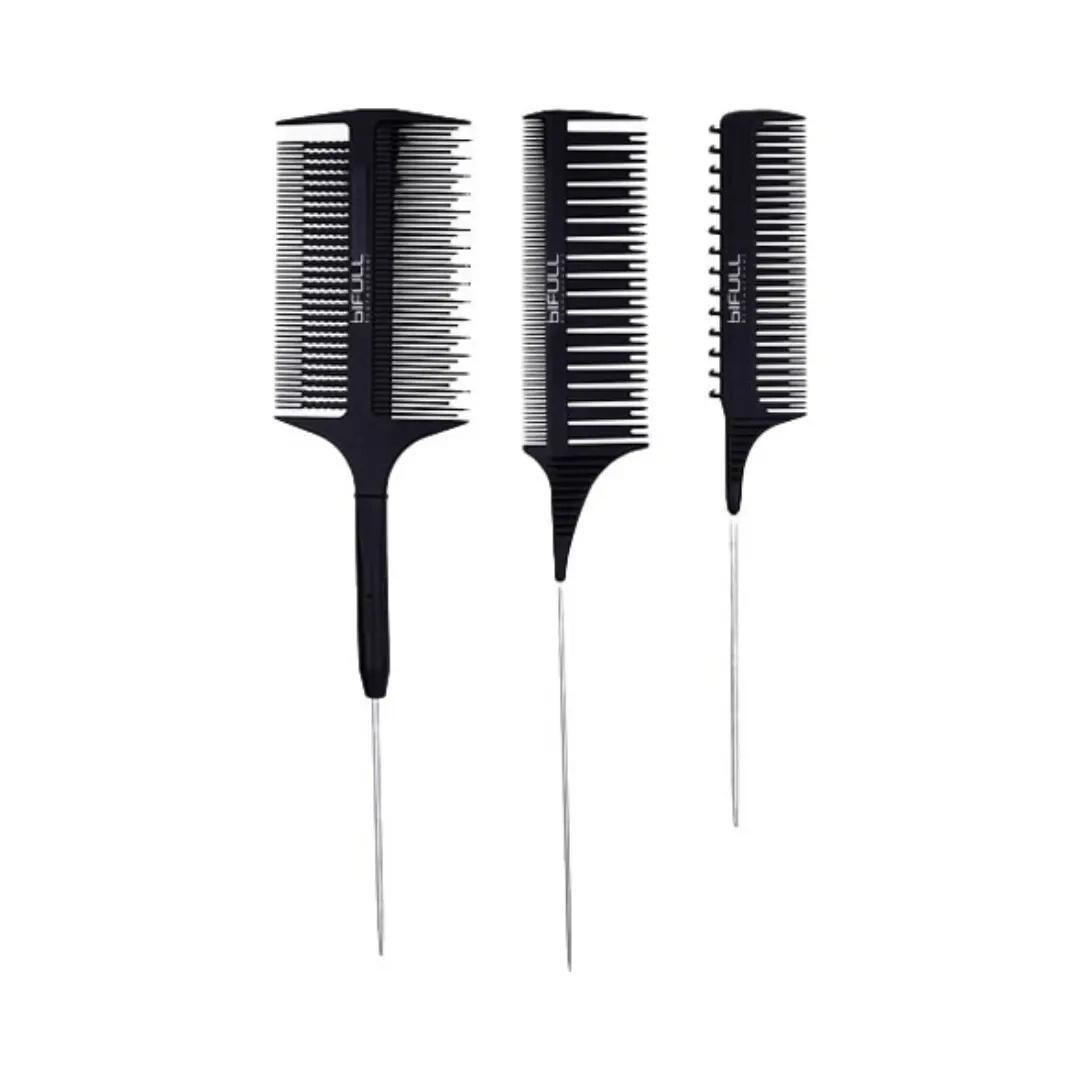 Profesionální sada BIFULL obsahuje tři specializované melírovací hřebeny, které usnadní rychlou a rovnoměrnou aplikaci melíru či barvy. Každý hřeben má jiný tvar zubů pro různé techniky – od klasického melírování přes jemné pramínky až po hustší oddělení. Ideální pro práci s fólií, volnou rukou nebo čepicí.