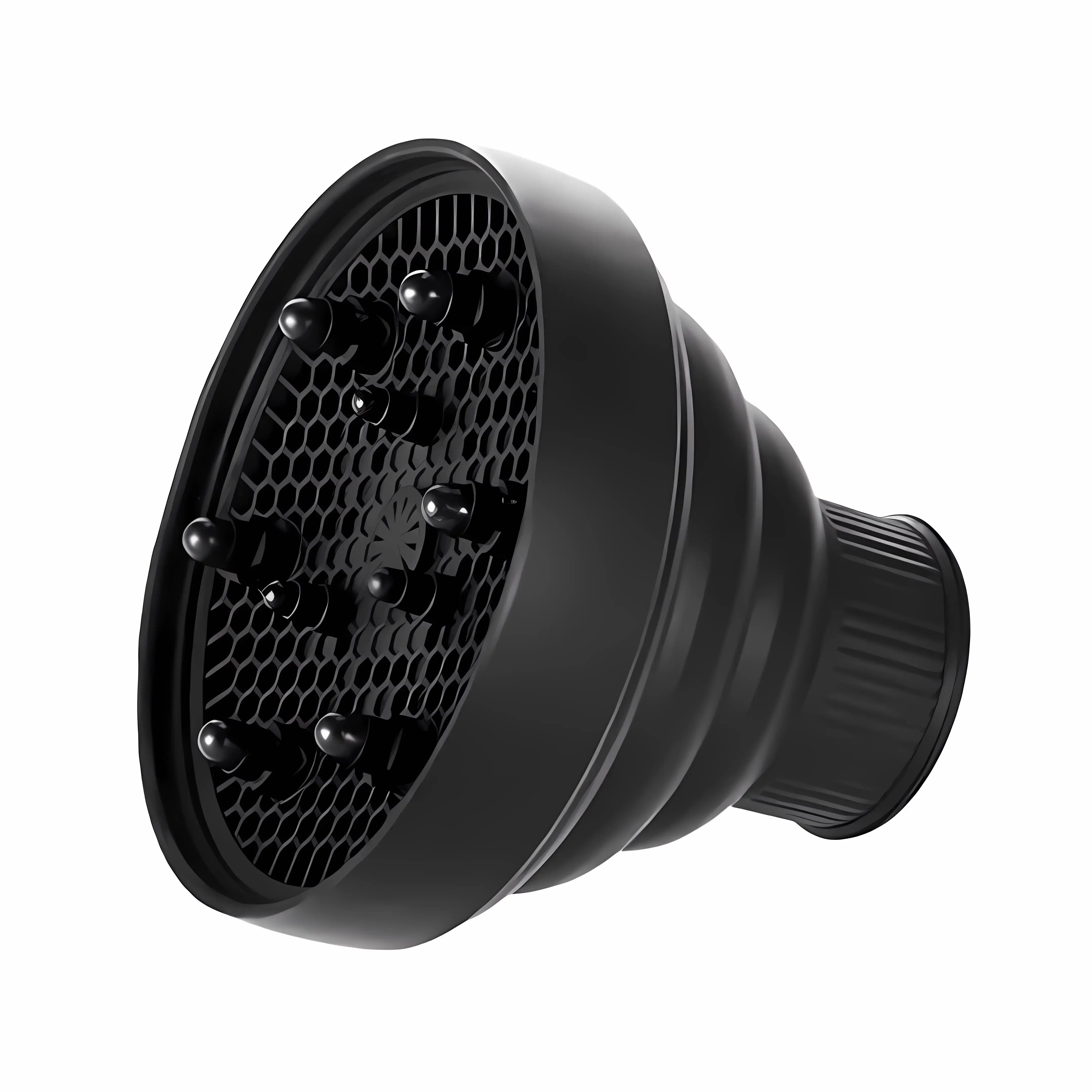 Difuzér je vyroben s pružnou gumovou konstrukcí, která se snadno skládá a je ideální pro přepravu a skladování v kadeřnickém salonu. Je vybaven vyfukovacími koncovkami pro dokonalou distribuci vzduchu. Je univerzálně vhodný pro všechny modely fénů. Nepostradatelný na cesty.