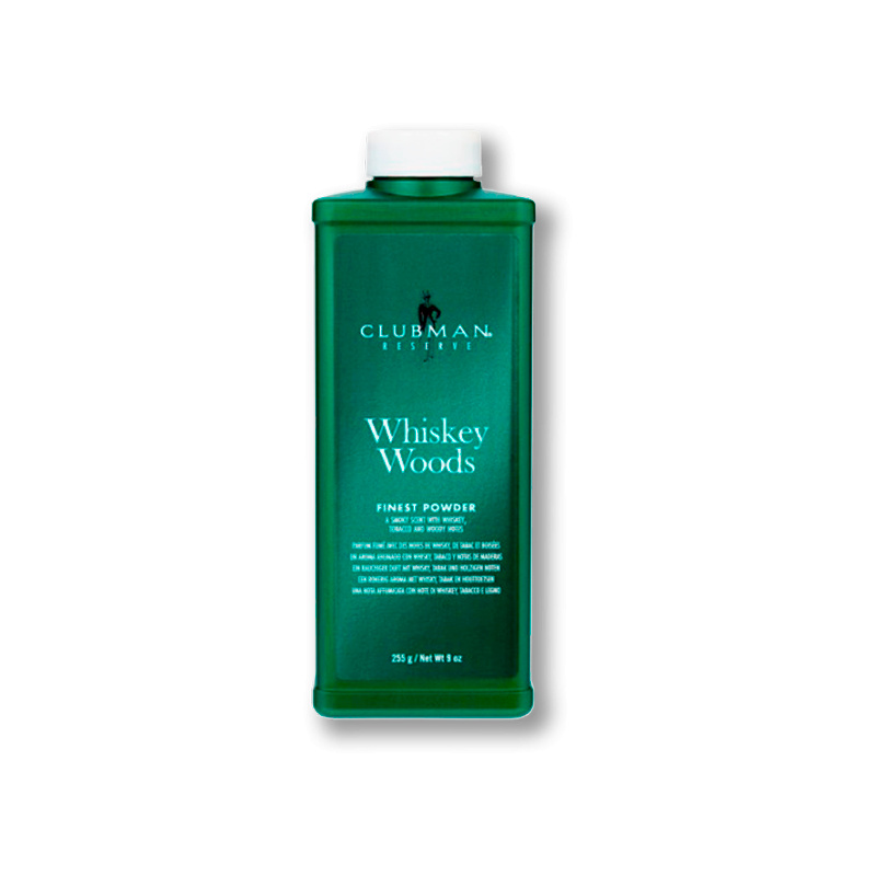 Clubman Whiskey Woods Talc je tělový pudr, který osvěžuje pokožku, absorbuje přebytečnou vlhkost a zanechává ji suchou, hebkou a příjemně provoněnou. Pomáhá předcházet podráždění po holení i sprchování a udržuje dlouhotrvající pocit svěžesti. Vůně Whiskey Woods kombinuje tóny tabáku, whisky, dřeva a koření, což jí dodává elegantní a mužný charakter. Velké balení 255 g je ideální pro každodenní použití doma i v profesionálních barber shopech.