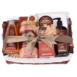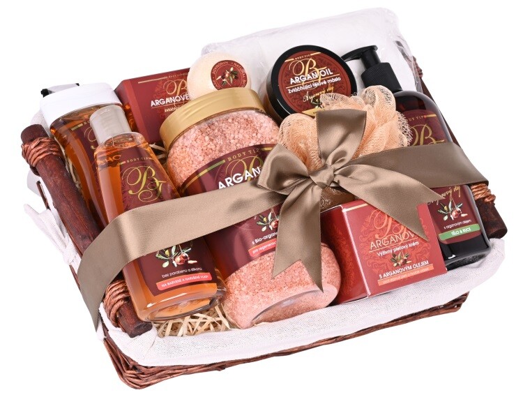 Luxusní dárkové balení kosmetiky s bio arganovým olejem pro péči o pokožku těla i obličeje v krásném dekorativním proutěném koši.