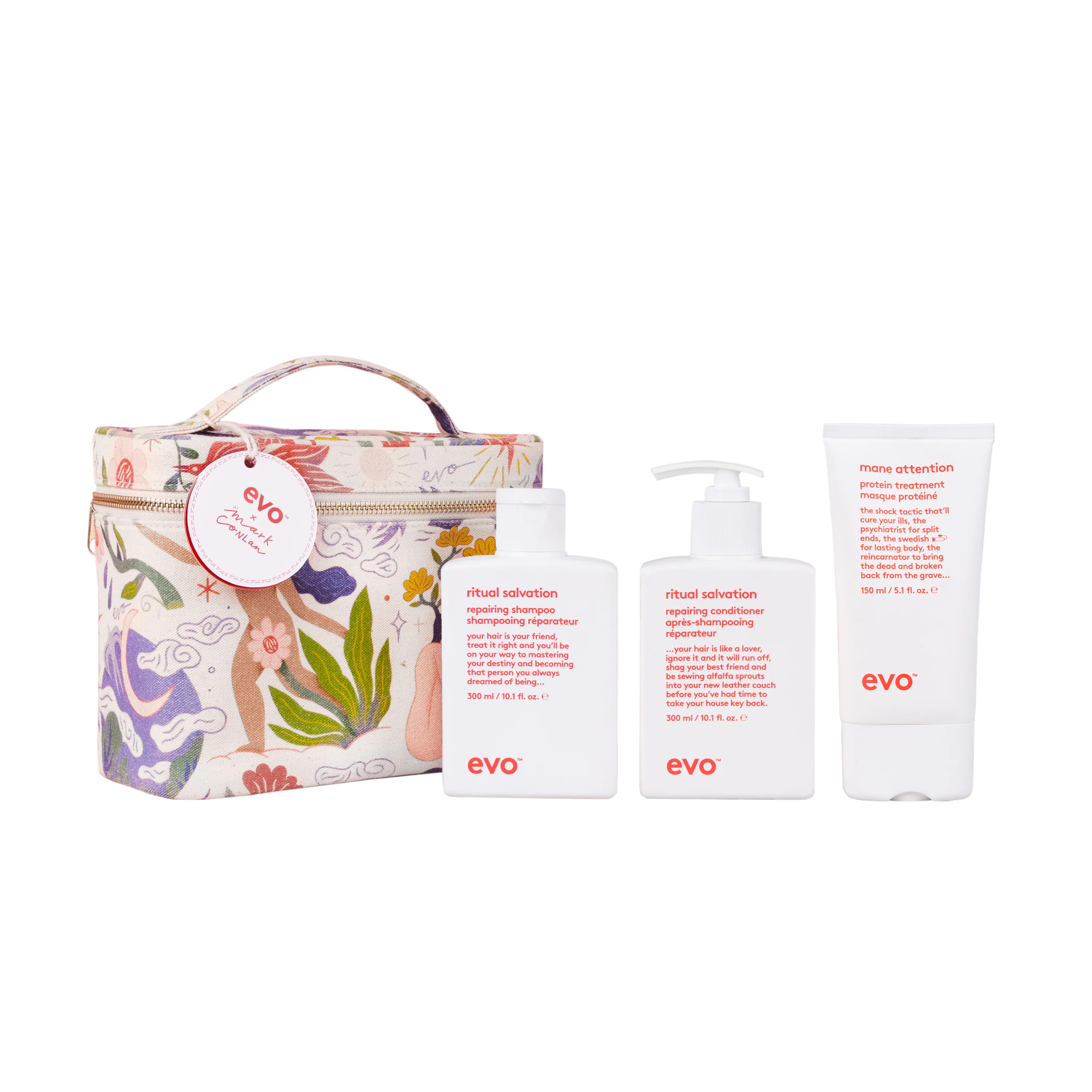 Ilustrátor Mark Conlan vypráví malé příběhy pomocí svých jedinečných, hravých návrhů a tato kreativní dárková sada vznikla ve spolupráci s irským umělcem. Evo Wonderlocks in Repair je kompletní set zaměřený na obnovu a posílení vlasů, které jsou oslabené, namáhané nebo poškozené. Spojuje šampon a kondicionér Ritual Salvation Repairing pro šetrné mytí, regeneraci a zpevnění vlasového vlákna a doplňuje je intenzivní proteinovou kúrou Mane Attention Protein Treatment, která pomáhá vlasům vrátit odolnost, poddajnost a lesk. Součástí balení je i limitovaná taška s exkluzivní ilustrací Marka Conlana, díky které je sada ideální jako dárek.