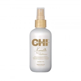 CHI Keratin Leave-In Conditioner od Farouk Systems je intenzivně pečující bezoplachový kondicionér navržený pro suché, poškozené nebo chemicky ošetřené vlasy. Kombinuje sílu přírodního keratinu, jojobového a arganového oleje, které společně regenerují a posilují vlasové vlákno, obnovují jeho pružnost a zabraňují lámání. Vlasy jsou po aplikaci hladké, lesklé a viditelně zdravější.