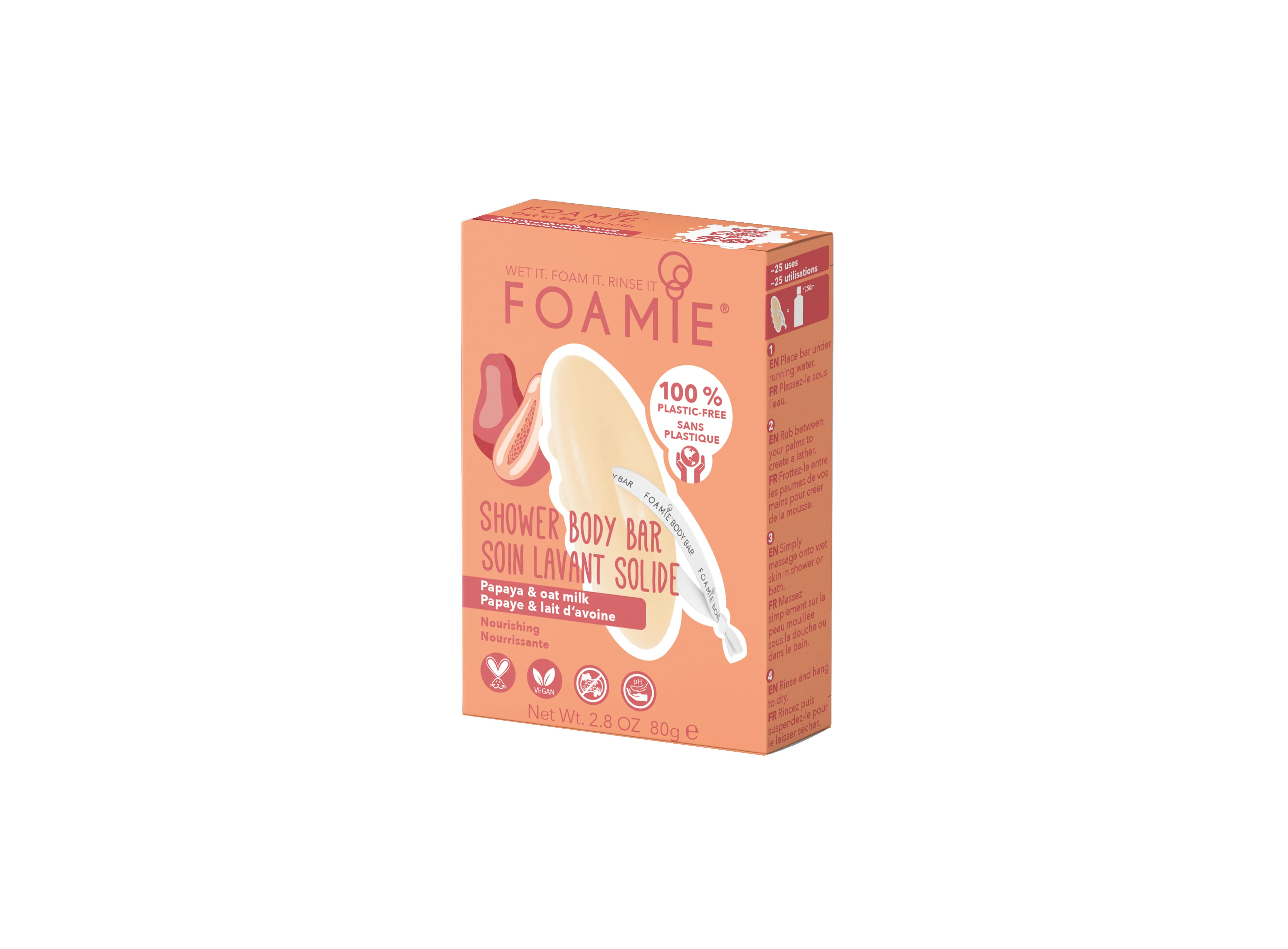 Tuhá sprchová péče Foamie Ovesné mléko a papája Unikátní syndet pro hebkou a čistou pokožku. Sprchová péče 2v1 čistí a zároveň hydratuje pokožku. Přirozené pH pokožku nedráždí. Neobsahuje plasty, sulfáty ani parabeny. Příjemná vůně papáje má uspokojující účinky. Použití: 1. Namočte pod tekoucí vodou. 2. Promasírujte v dlaních pro vytvoření pěny. 3. Masírujte pokožku a užijte si sprchování! 4. Důkladně opláchněte. Po použití zavěste na šňůrku a nechte vyschnout.