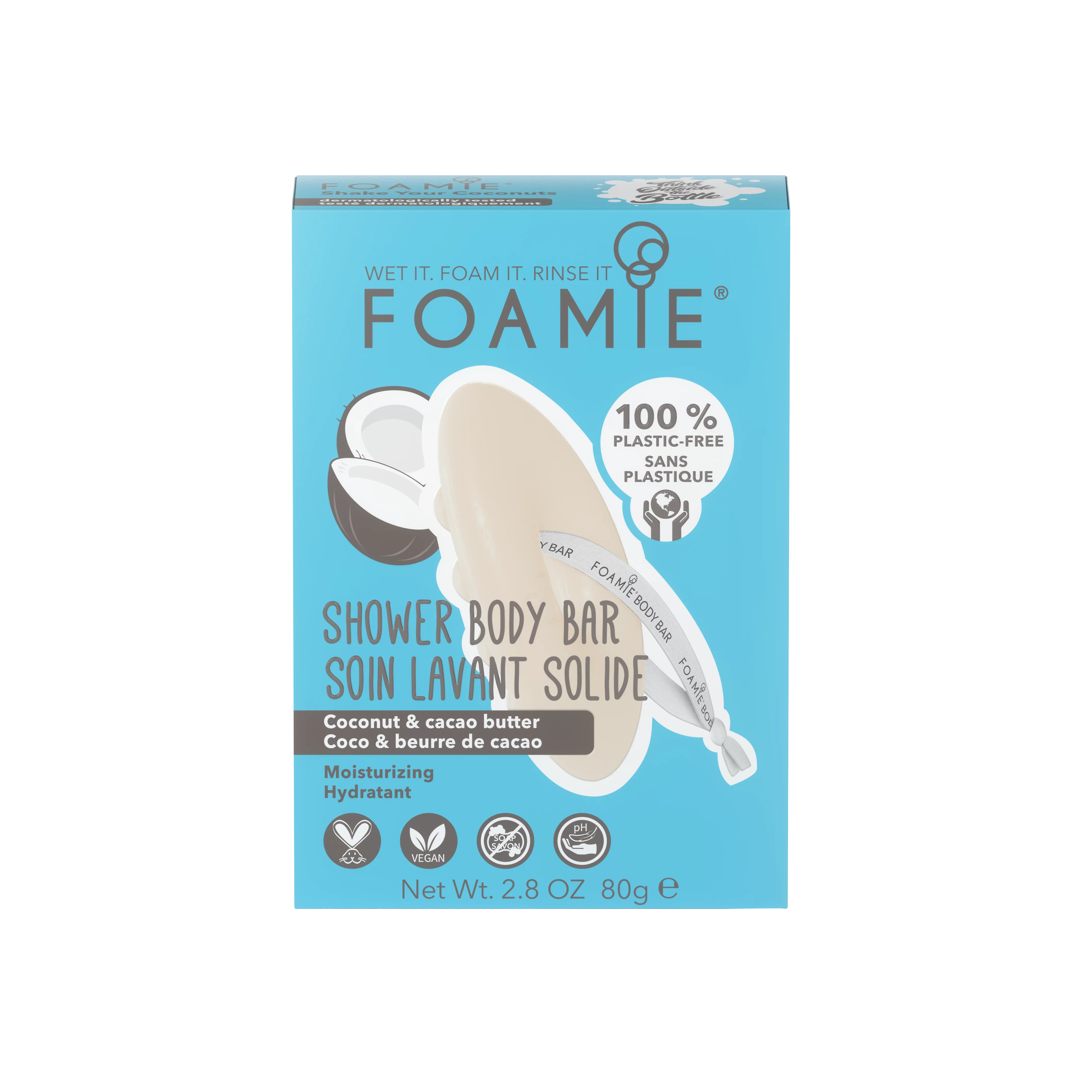 Tuhá sprchová péče Foamie Kokos a kakaové máslo Unikátní syndet pro hebkou a čistou pokožku. Tuhá sprchová péče 2v1 čistí a zároveň hydratuje pokožku. Přirozené pH pokožku nedráždí. Neobsahuje plasty, sulfáty ani parabeny. S příjemnou vůní kokosu a kakaového másla. Použití: 1. Namočte pod tekoucí vodou. 2. Promasírujte v dlaních pro vytvoření pěny. 3. Masírujte pokožku a užijte si sprchování! 4. Důkladně opláchněte. Po použití zavěste na šňůrku a nechte vyschnout.