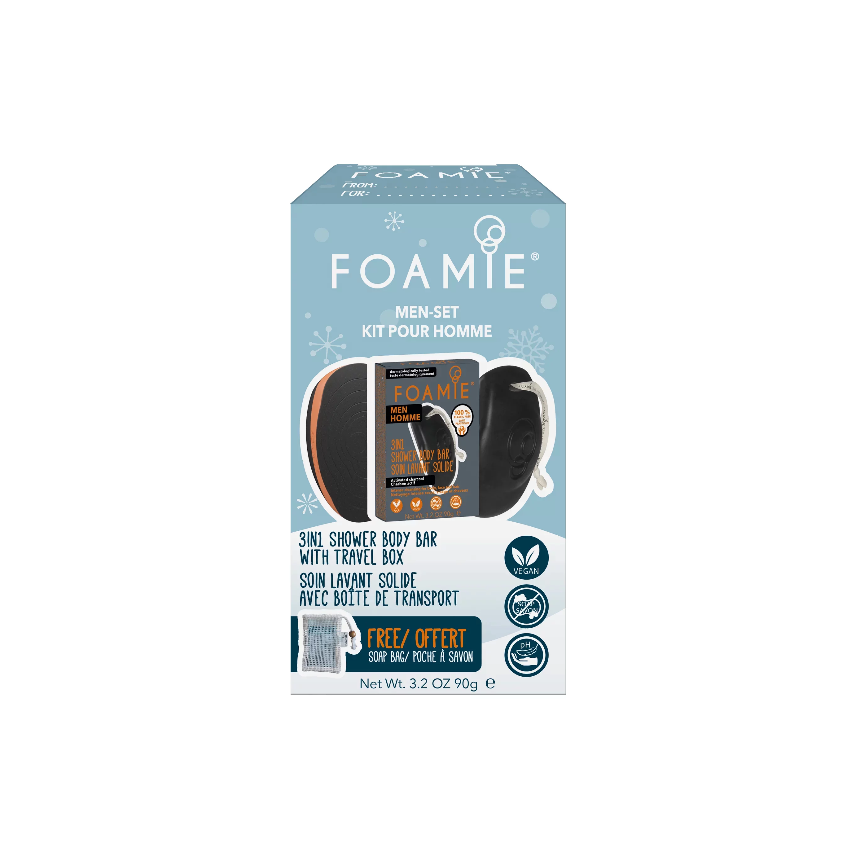 Vánoční limitovaný Starter set Body Men. Obsah: Sprchová péče Foamie Men 3v1, Travel Buddy box.