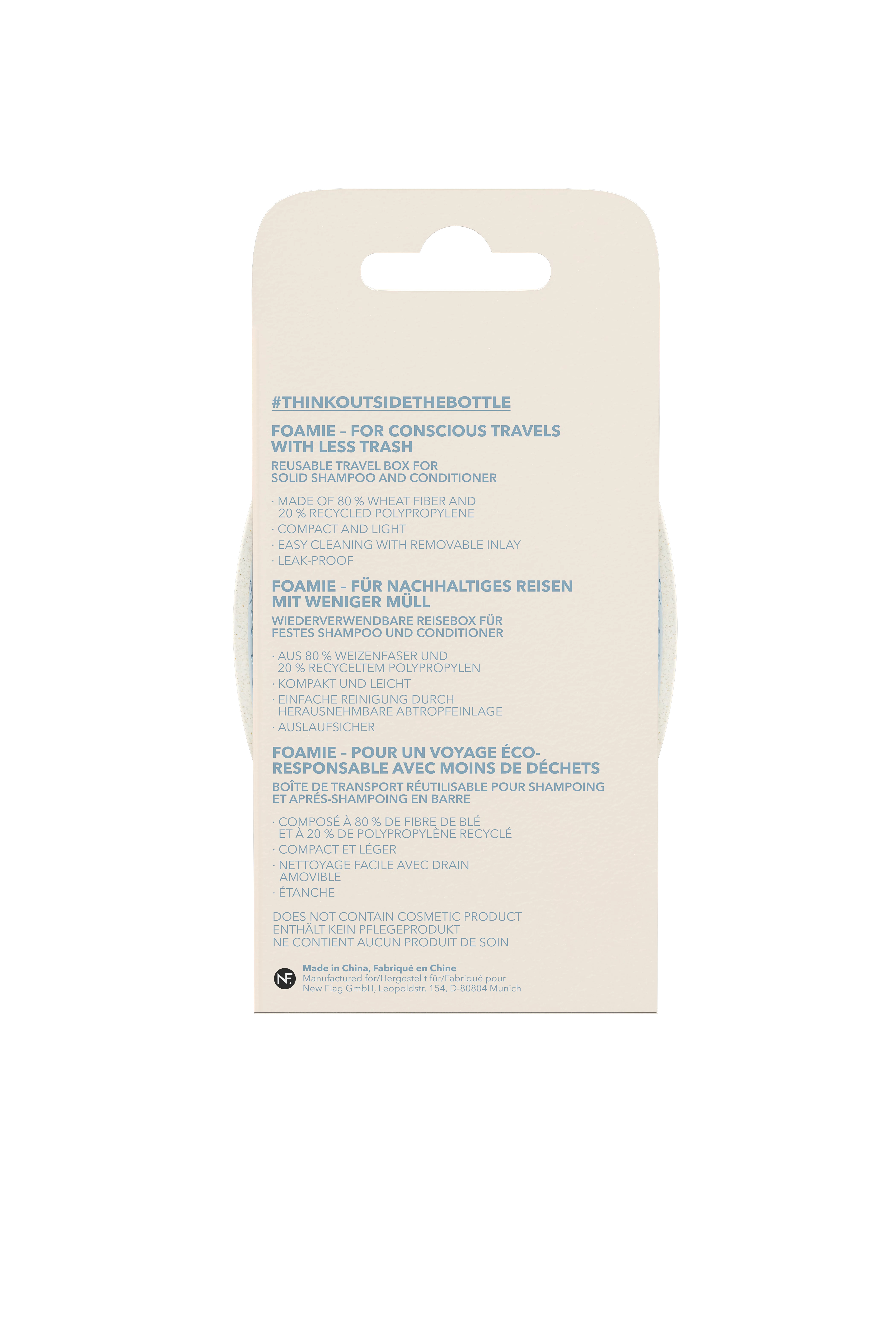 Cestovní přenosný obal na tuhý šampon a kondicionér. Vyrobeno z 80 % pšeničných vláken a 20 % recyklovaného polypropylénu. Lehký a kompaktní. S odnímatelnou a lehko omývatelnou vnitřní vložkou. Neprosakuje. Neobsahuje kosmetický produkt.