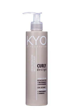 KYO CURLY DESIGN stylingový krém pro dokonalé vlny. Je stylingový krém obohacený o vitamin B5 a mandlový olej. Pomáhá oživit a definovat vlasy před úpravou. Zesiluje strukturu kudrnatých a zvlněných vlasů. Jeho výživný vzorec dodává objem, měkkost a pružnost vlnitým vlasům. Má antistatickou schopnost. Vlasy zůstávají lehké, lesklé a přirozeně vlnité.