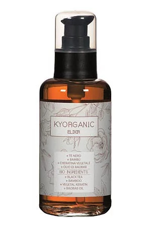 Freelimix KYO KYORGANIC ELIXÍR na vlasy. Elixír obsahuje funkční biologické ingredience ( černý čaj, bambus, baobabový olej ) a rostlinný keratin. Ochraňuje před fyzickým a mechanickým stresem, hydratuje, vyživuje a chrání splihlé konečky, dodává živost a lesk pohaslým vlasům. Jsou jemnější a bez zatížení.