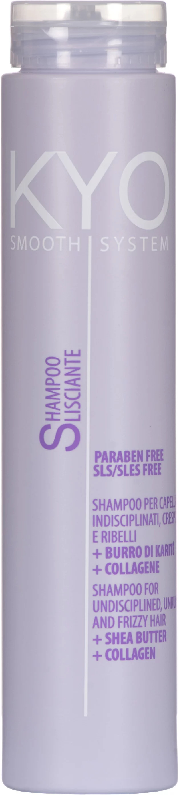 KYO šampon uhlazující bez parabenu. Obohacený o kolagen a bambucké máslo, SMOOTHSYSTEM šampon jemně čistí, dodává lesk a uklidňuje vlasovou strukturu. Vyživuje dodáním jemnosti, chrání před krepatostí a to bez ztěžknutí vlasů a dodává uhlazující efekt. Je bez SLS/SLES a bez parabenu.