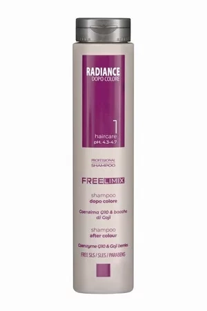 Freelimix šampon po barvení RADIANCE. Šampon určen pro ochranu barvených vlasů. S koenzymem Q10 a Goji bobulemi. Jemně odstraňuje nečistoty, zabraňuje vymývání barvy z vlasového vlákna. Jeho pH 4.3-4.7 podporuje stálost a zářivost barvených vlasů. Má regenerační a vyživující účinky. Neobsahuje SLS / SLES a PARABEN.