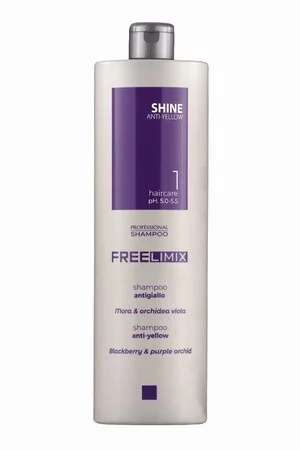 Freelimix šampon na vlasy proti žloutnutí - ANTIGIALLO. Neutralizační šampon pro odstranění nežádoucích žlutých tónů po odbarvení, melírování. Obohacený o výtažky z ostružiny a fialové orchideje. Určen i pro zářivou blond nepigmentovaných a šedých vlasů. Dodává hydrataci, zlepšuje vitalitu a lesk barvených vlasů.