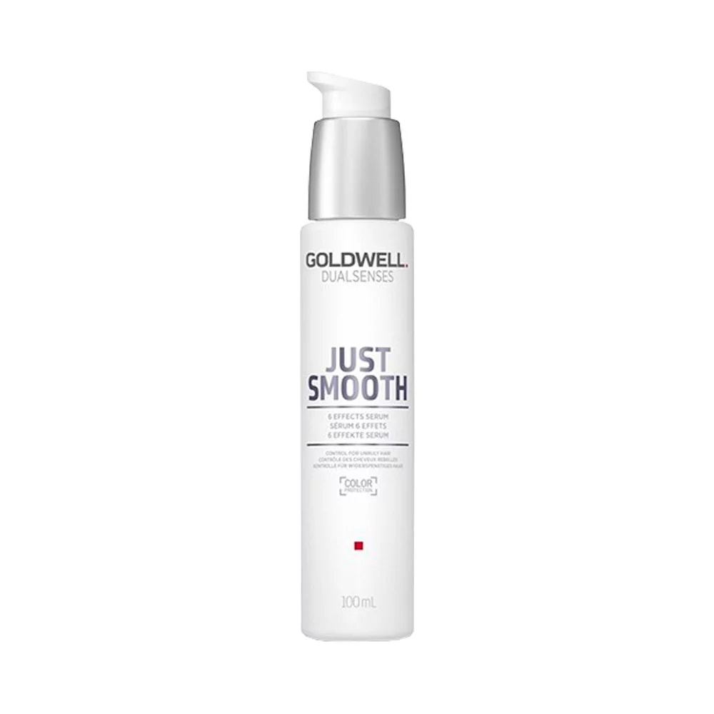 Goldwell Dualsenses Just Smooth 6 Effects je pečujicí bezoplachové sérum pro zkrocení nepoddajných vlasů se sklonem ke krepatění. Sérum vlasy chrání před krepatěním a vlhkostí, uhlazuje vlasy po celé délce, dodává jim intenzivní lesk a pružnost. Produkt obsahuje olej z ořechu Kukui, který má hydratační účinky. Tato aktivní složka vyrovnává poréznost vlasů a usnadňuje rozčesávání.