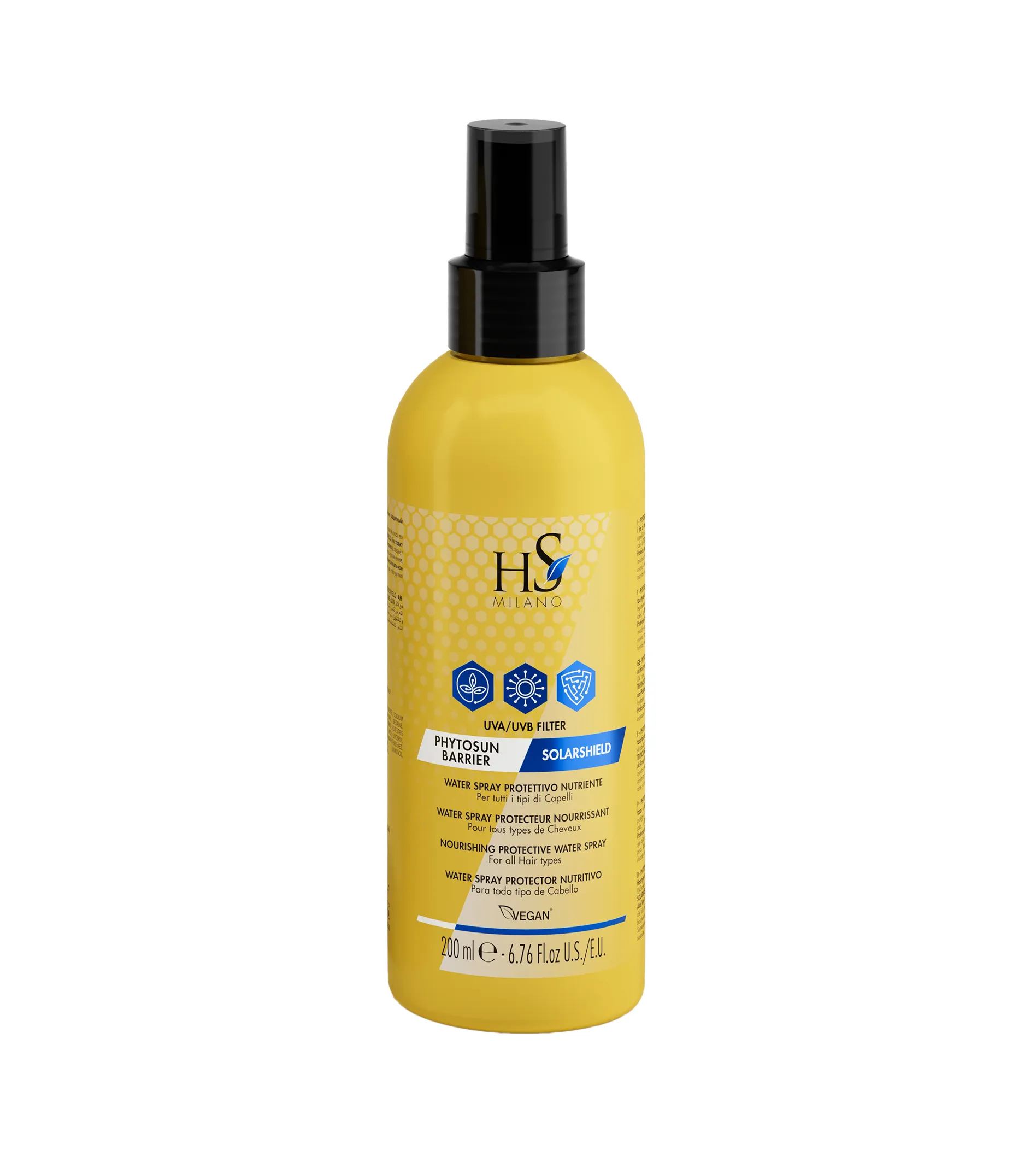 HS Milano Phytosun Barrier Nourishing Protective Water Spray je ochranný bezoplachový sprej navržený pro vlasy vystavené slunci, moři a bazénu. Vytváří neviditelnou ochrannou bariéru, která pomáhá chránit vlasové vlákno i barvu před poškozením a zároveň udržuje vlasy hydratované a lehké.