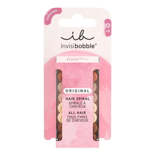 Vlasové gumičky Invisibobble® Original jsou díky svému spirálovitému tvaru ohleduplné k vlasům, netahají, nelámou, nevytváří na vlasech otlak, ani v nich nezanechávají stopy. Jsou hygienické, voděodolné a díky svému hladkému povrchu se nezamotají do suchých ani do mokrých vlasů. Balení obsahuje 8ks gumiček v několika barevných variantách.
