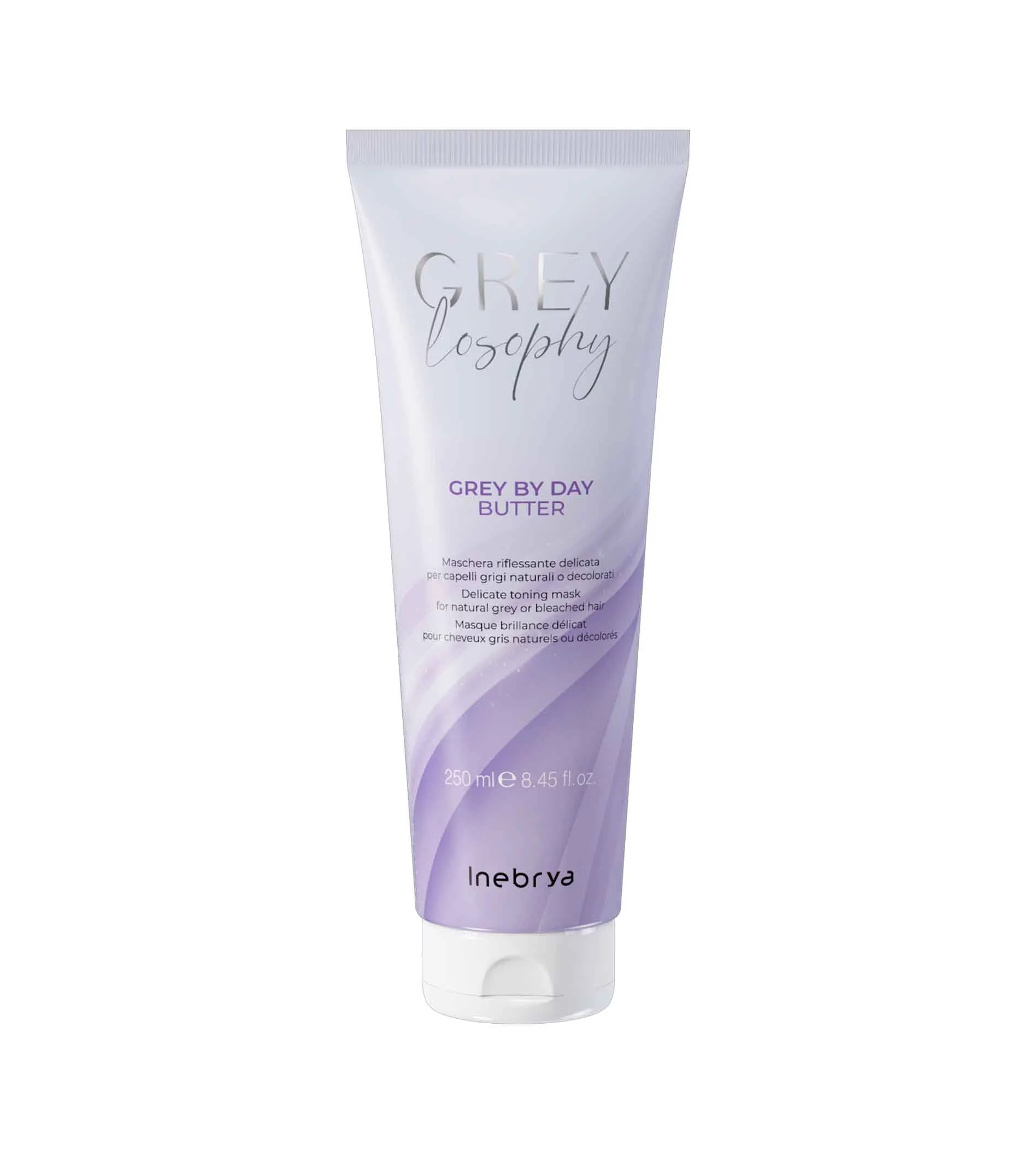 Inebrya Grey By Day Butter 250 ml je jemná tónovací maska navržená speciálně pro přírodní šedé a odbarvené platinově blond vlasy. Tato maska je obohacena o avokádový olej a bambucké máslo, které poskytují intenzivní hydrataci, výživu a lesk. Díky svému složení pomáhá eliminovat nežádoucí žluté tóny, zvyšuje lesk a usnadňuje rozčesávání vlasů. Produkt je 100% veganský a neobsahuje silikony.