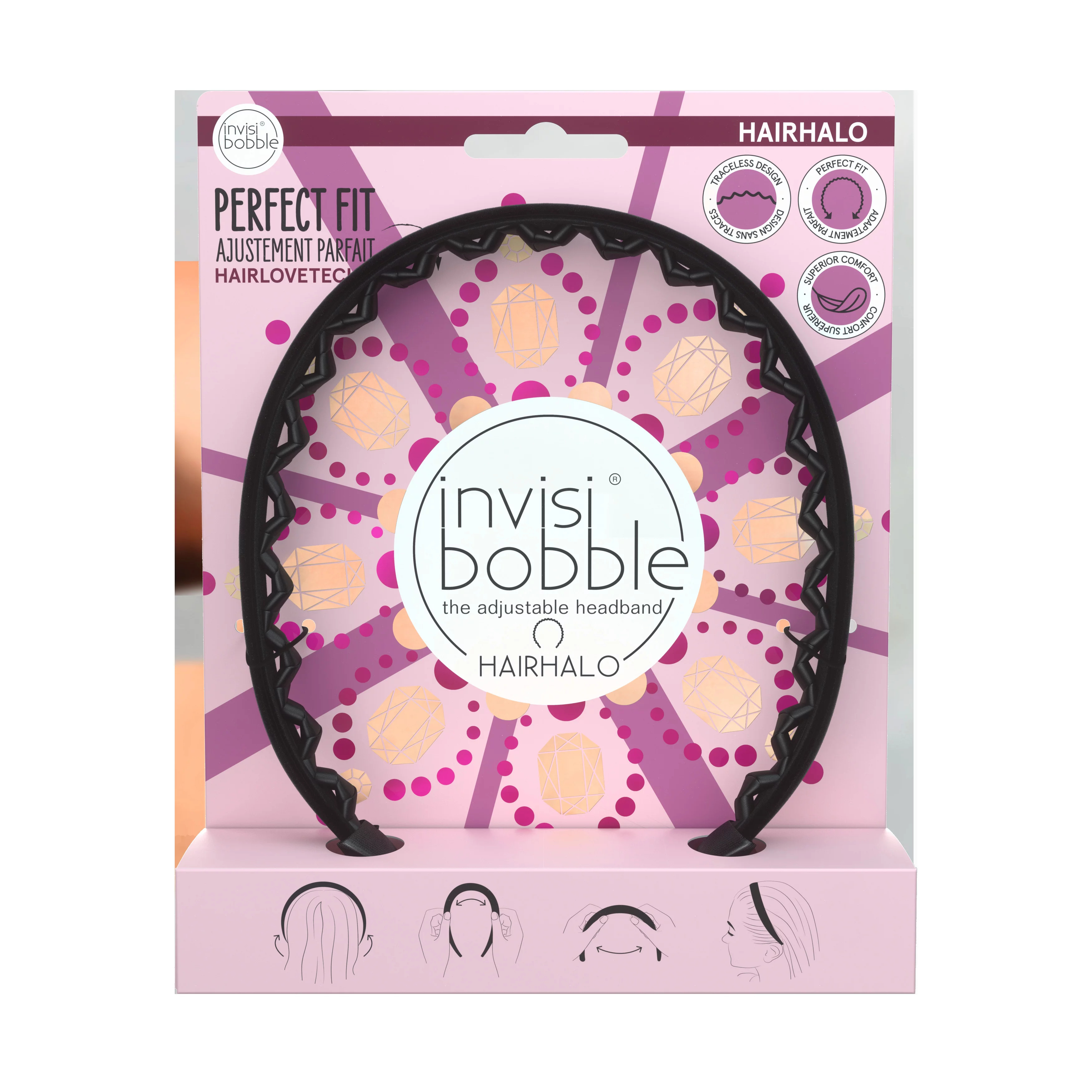 Invisibobble HAIRHALO Inspirován svými fanoušky z celého světa, invisibobble® oslavuje jejich rozmanitost a smysl pro styl. Nastavitelná čelenka invisibobble® HAIRHALO tak dostává design v limitované edici. HAIRHALO Crown and Glory s jemným černým sametovým materiálem se hodí ke každému oblečení a je dokonalým doplňkem pro prázdninové období.