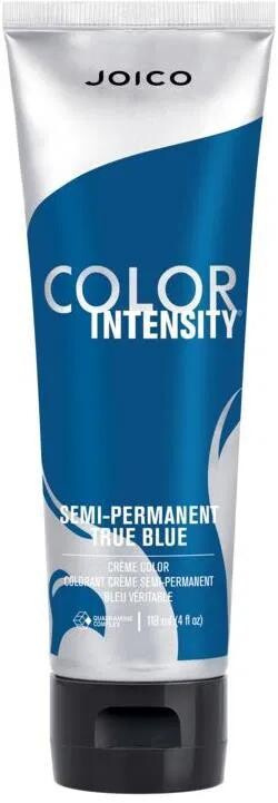Joico Color Intensity True Blue je polodlouhotrvající krémová barva na vlasy, která nabízí intenzivní modrý odstín. Tato barva nevyžaduje použití oxidačního činidla a vydrží až 20 umytí, přičemž postupně bledne na pastelový nádech.