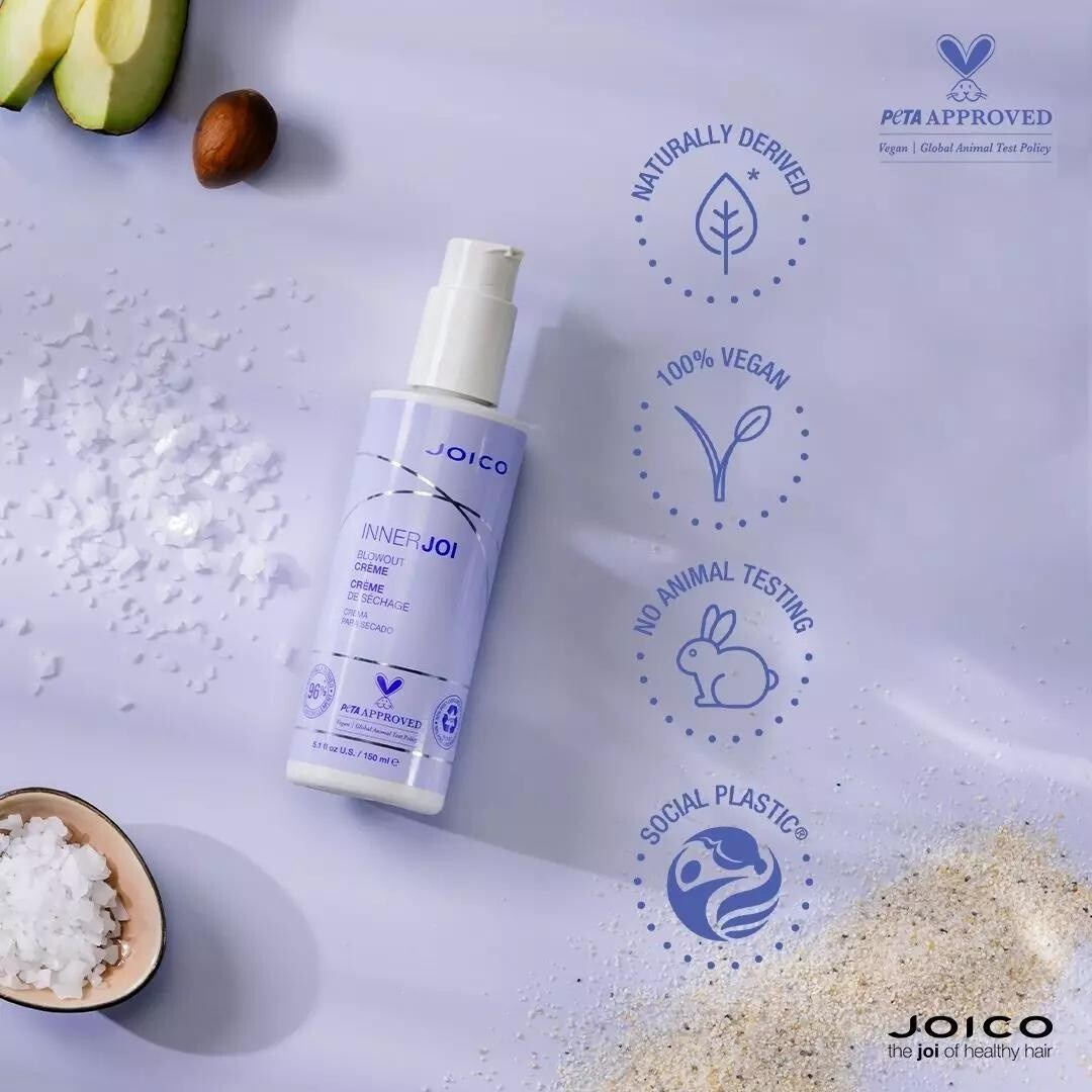 InnerJoi Blowout Crème je univerzální stylovací přípravek s lehkou texturou, který můžete použít jak na foukání vlasů, tak pro přirozené schnutí. Poskytuje ochranu proti teplu až do 232 °C a zabraňuje krepatění až na 72 hodin, přičemž dodává vlasům pružnost, lesk a hebkost.