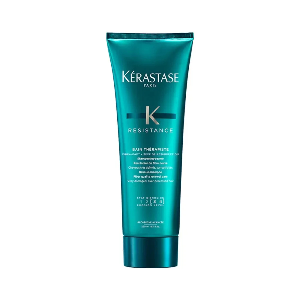 Kérastase Resistance Bain Thérapiste Shampoo je pečující šampon pro velmi poškozené vlasy. Extra krémový šampon Kérastase Resistance Bain Thérapiste s unikátní texturou, který napravuje poškození vlasů během mytí. Jemně pečuje o velmi poškozené vlasy. Nové balení speciálně vyvinuto pro tuto gelovou hustou texturu. Napravuje vlasovou strukturu, bohatá pěna nasytí a obalí vlasové vlákno a během mytí eliminuje tření. Zaceluje vlasové vlákno a brání před dalším poškozením.