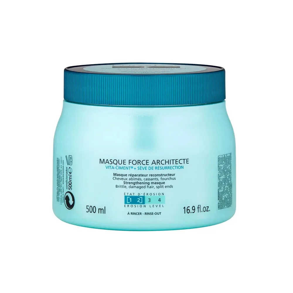 Kérastase Résistance Masque Force Architecte je posilující maska pro oslabené, poškozené a roztřepené konečky. Rekonstruuje a obnovuje každé vlasové vlákno. Vlas je posílen zevnitř ven a chráněn před poškozením. Vyživuje vlasy a uhlazuje jejich pórovitý povrch a chrání vlasy před lámavostí a třepení konečků. Okamžitě vlasy rozčesává, zjemňuje a usnadňuje úpravu. Navrací vlasům ztracený lesk a zanechává je hedvábně jemné.