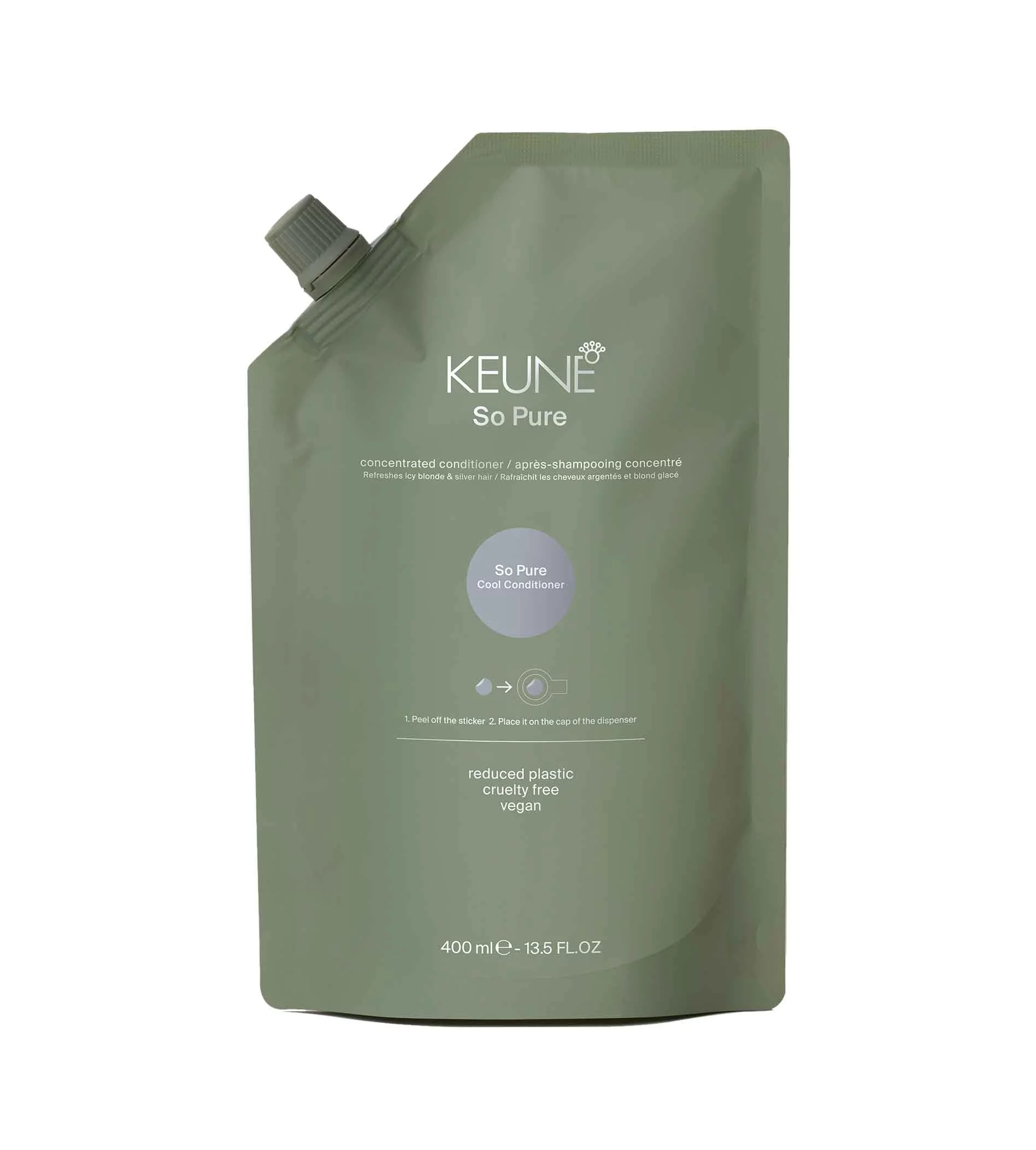 So Pure Cool neutralizuje měděné odstíny. Vydatné fialové pigmenty potlačují teplé tóny. Ve složení produktů Cool jsou obsaženy mimo jiné výtažky z plodů acai, které pomáhají chránit vlasy před oxidací a vyblednutím barvy. Zanechává vlasy hedvábně hebké, hydratované a ledově zářící. So Pure Cool kondicionér odstraňuje veškeré zbytky měděných odlesků a dodává vlasům bohatou hydrataci.