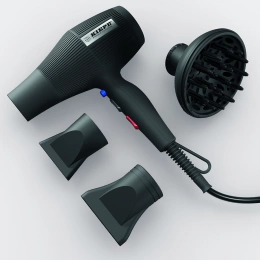 KIEPE BARBER THOOR - vysoce kvalitní a vysoce účinný fén. S motorem o výkonu 1800- 2200 W. THOOR je schopen zajistit konstantní a silný proud vzduchu, ideální pro rychlé vysoušení vlasů. Moderní a elegantní design fénu s charakteristický čistými a elegantními liniemi, je doprovázen povrchovou úpravou soft-touch dodává pocit vysoké kvality a pozornosti k detailu. Perfektní pro profesionální použití v salonu. Přítomnost dvou výměnných trysek, jedné široké a druhé úzké, které vám umožní soustředit se na proudění vzduchu tam, kde je to nejvíce potřeba. Kromě toho vám různá nastavení rychlosti a teploty umožňují přizpůsobit různým potřebám sušení.