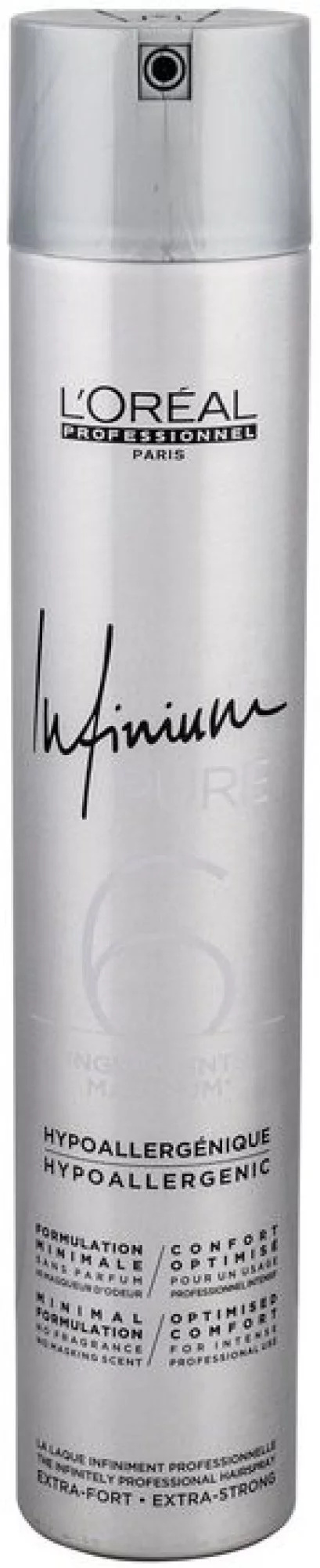 Hypoalergenní, ultra lehký lak na vlasy Infinium Pure Extra Strong od L’Oréal Professionnel s rychleschnoucí, silnou fixací. Nezanechává ve vlasech zbytky, dodává vlasům lesk. Nová receptura obsahuje pouhých 6 funkčních látek. Bez parfemace, vhodný i pro citlivou pokožku.