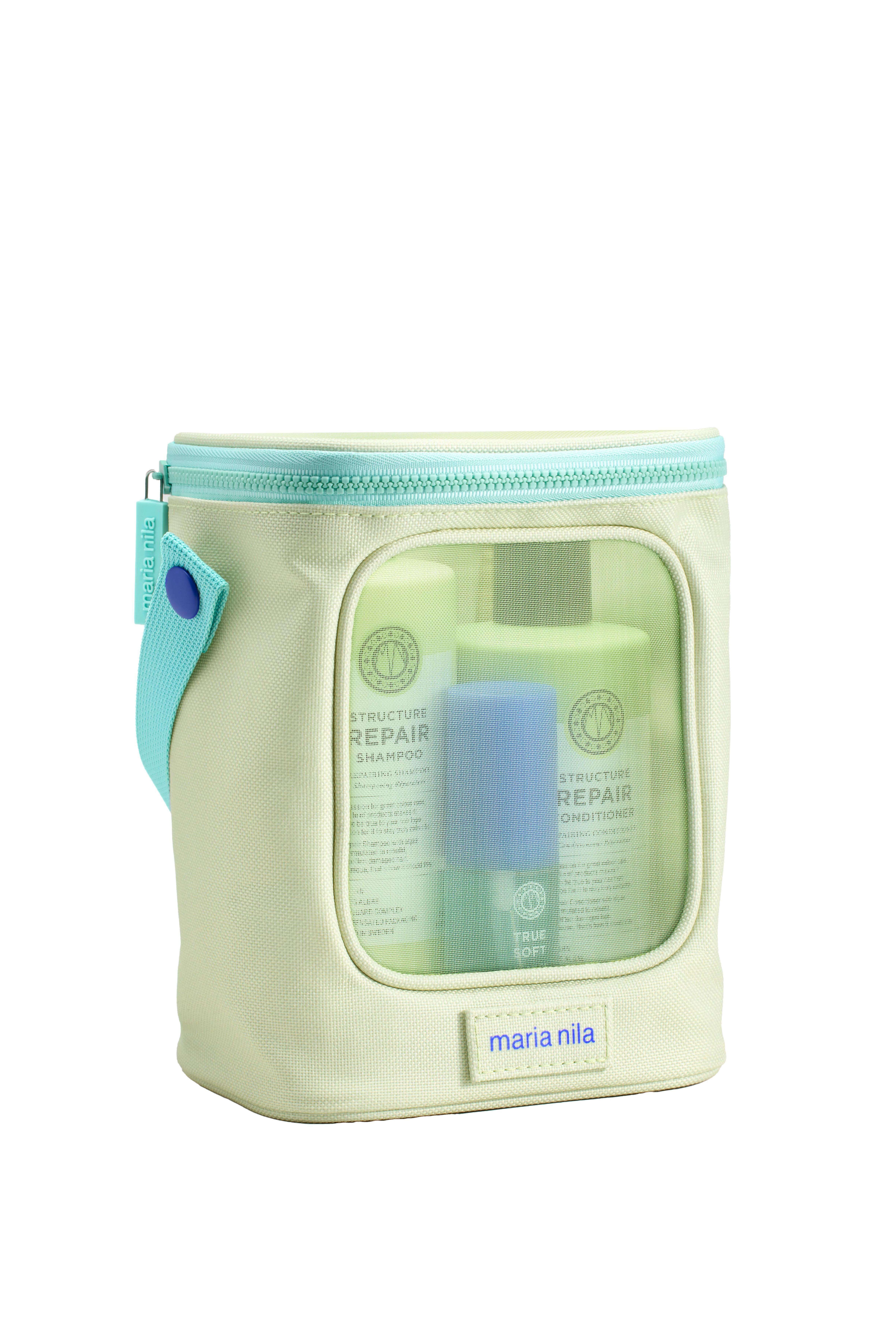 Structure Repair Beauty Bag je multifunkční kosmetická taška s průhlednou síťovinou pro dokonalý přehled o obsahu. Je vyrobena ze 100% recyklovaného materiálu a obsahuje tvůj oblíbený šampon a kondicionér spolu s exkluzivním limitovaným arganovým olejem, který vlasy regeneruje a vyživuje. 100% veganský produkt