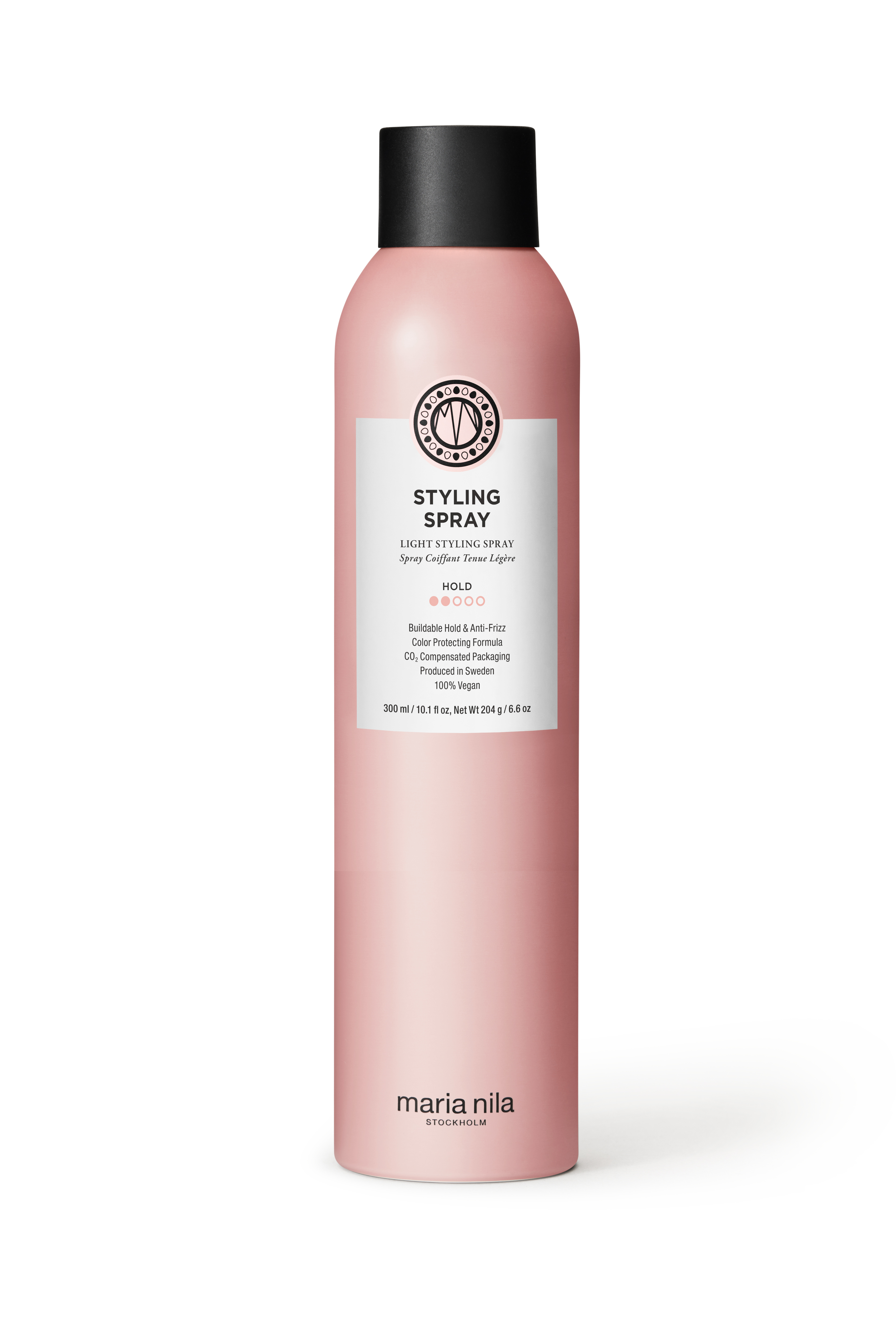 MARIA NILA STYLING SPRAY je jemný lak na vlasy s lehkou fixací. Dodává vlasům lesk a omezuje jejich krepatění. Komplex Colour Guard chrání vlasy před UV zářením a volnými radikály a zajišťuje déle trvající zářivou barvu.