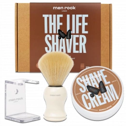 Men Rock The Life Shaver Sandalwood Set je klasická sada na holení s elegantní vůní santalového dřeva, která kombinuje krém na holení, štětku a praktický stojan. Nabízí kompletní řešení pro tradiční holicí rituál – bohatou pěnu, precizní aplikaci a správnou péči o pomůcky.