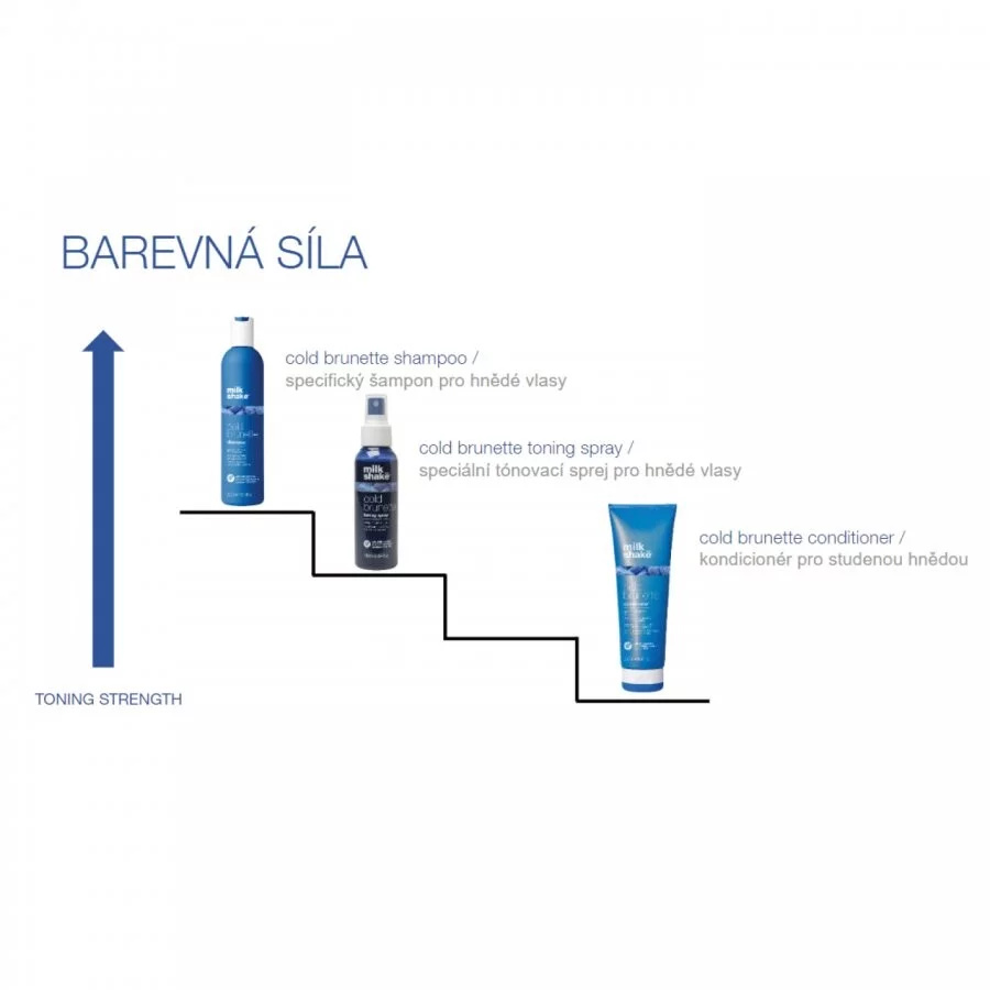 Jedinečný sprej vyvinutý se speciálním modrým pigmentem, který působí proti teplým, měděným, červeným/oranžovým tónům v hnědých vlasech. Posiluje a hydratuje vlasy, dodává vlasům zdravý vzhled. Pro intenzivnější tónování, doporučujeme kombinovat s dalšími produkty z řady cold brunette. Bez parabenů a SLES.