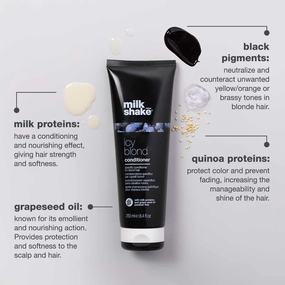 Milk_shake Icy Blond Conditioner je profesionální kondicionér určený pro velmi světlé, platinové nebo zesvětlené blond vlasy. Jeho jedinečné složení s černým pigmentem neutralizuje nežádoucí žluté či mosazné tóny a dodává vlasům chladný, popelavý nebo stříbrný odstín. Kondicionér přináší jemnost, hebkost a lesk, pomáhá udržet svěží chladný tón blond vlasů a chrání jejich barvu.