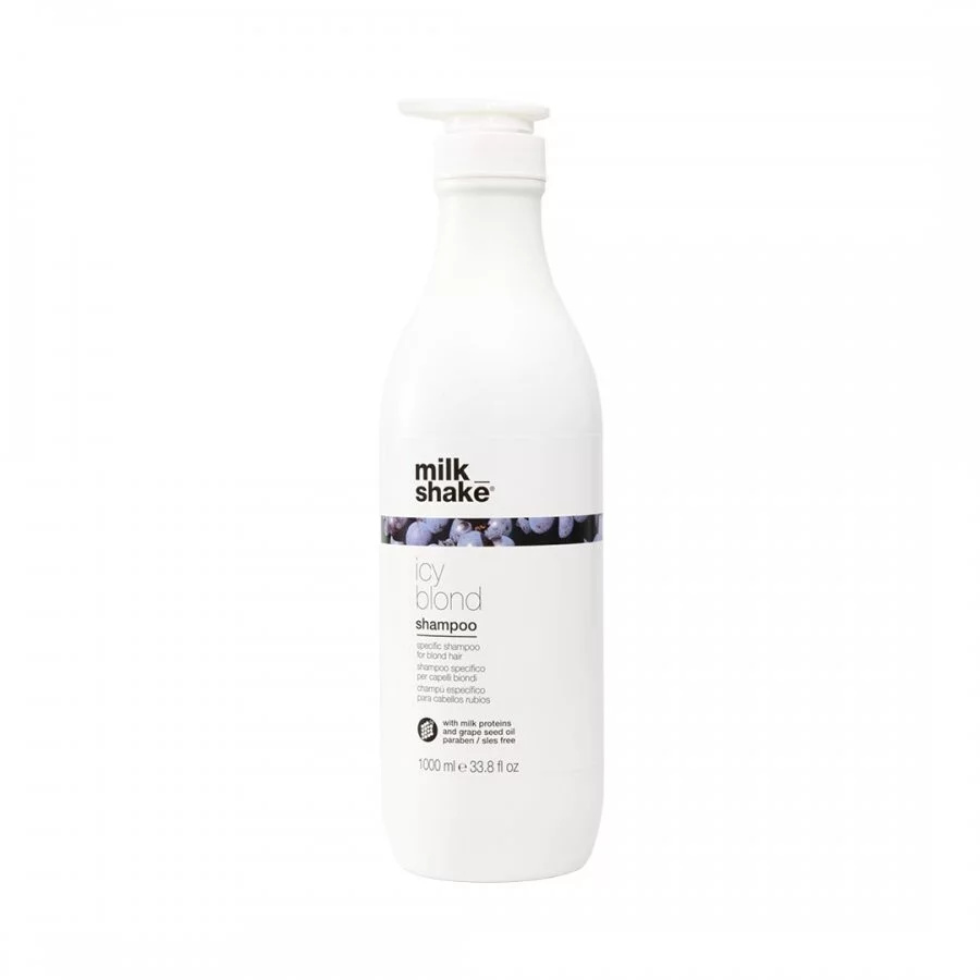 Milk_shake Icy Blond Shampoo je profesionální šampon určený především pro velmi světlé, chladné blond nebo platinové vlasy. Nejde o běžný fialový šampon — díky speciálnímu černému pigmentu neutralizuje žluté, oranžové nebo mosazné odstíny a dodává vlasům chladný, popelavý nebo stříbrný tón s elegantním leskem. Šampon je bez sulfátů typu SLES a bez parabenů, což umožňuje jemné a šetrné čištění vlasů při zachování jejich barvy a vitality. Výsledkem je sofistikovaný vzhled stříbřité studené blond.