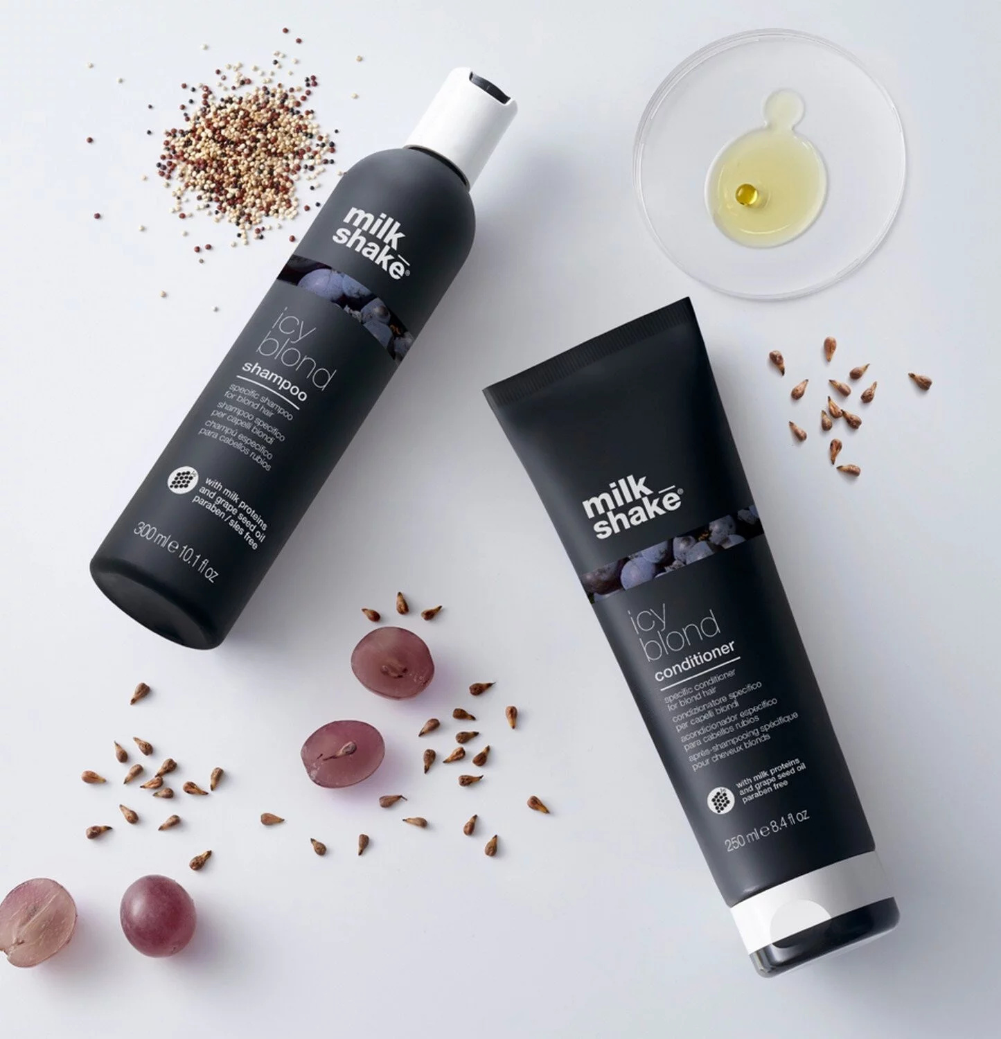 Pro dosažení nejlepších výsledků doporučujeme kombinovat Milk_shake Icy Blond Shampoo s kondicionérem ze stejné řady (Milk_shake Icy Blond Conditioner). Pokud dosáhnete požadovaného chladného odstínu, je vhodné šampon občas střídat s jemnějším šamponem, aby barva zůstala přirozená a vlasy zdravé.
