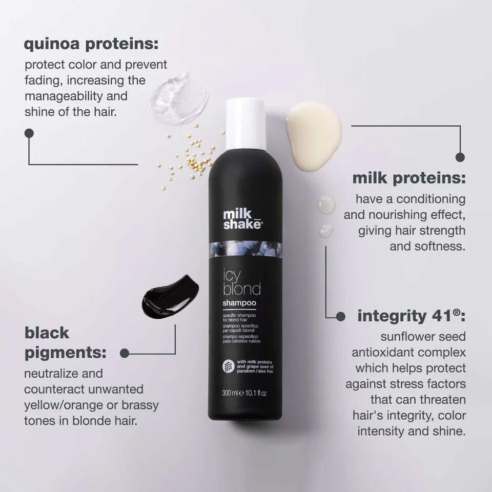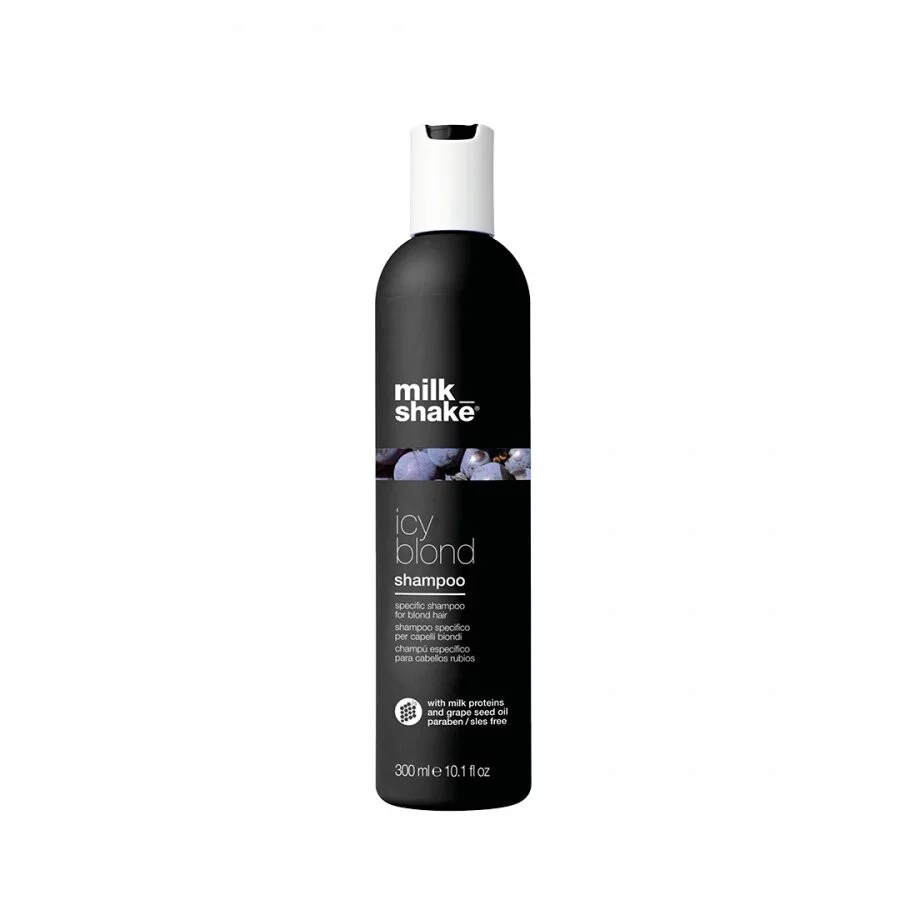 Milk_shake Icy Blond Shampoo je profesionální šampon určený především pro velmi světlé, chladné blond nebo platinové vlasy. Nejde o běžný fialový šampon — díky speciálnímu černému pigmentu neutralizuje žluté, oranžové nebo mosazné odstíny a dodává vlasům chladný, popelavý nebo stříbrný tón s elegantním leskem. Šampon je bez sulfátů typu SLES a bez parabenů, což umožňuje jemné a šetrné čištění vlasů při zachování jejich barvy a vitality. Výsledkem je sofistikovaný vzhled stříbřité studené blond.