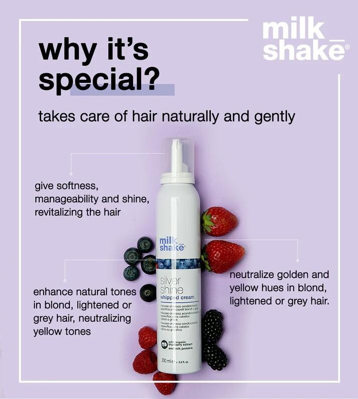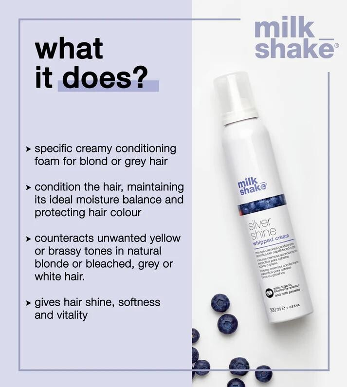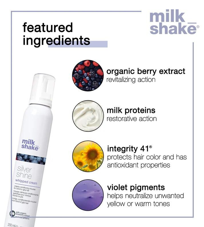 Milk_Shake Silver Shine Whipped Cream je bezoplachová krémová pěna určená pro blond, zesvětlené, šedivé a bílé vlasy. Jemně, ale účinně vlasy vyživuje a současně pomáhá neutralizovat nežádoucí žluté a teplé tóny v jednom kroku. Díky kombinaci speciálního fialového pigmentu, organických výtažků ze směsi bobulovin, mléčných proteinů a komplexu Integrity 41® pomáhá zachovat barvu vlasů a udržet chladný, čistý odstín.
