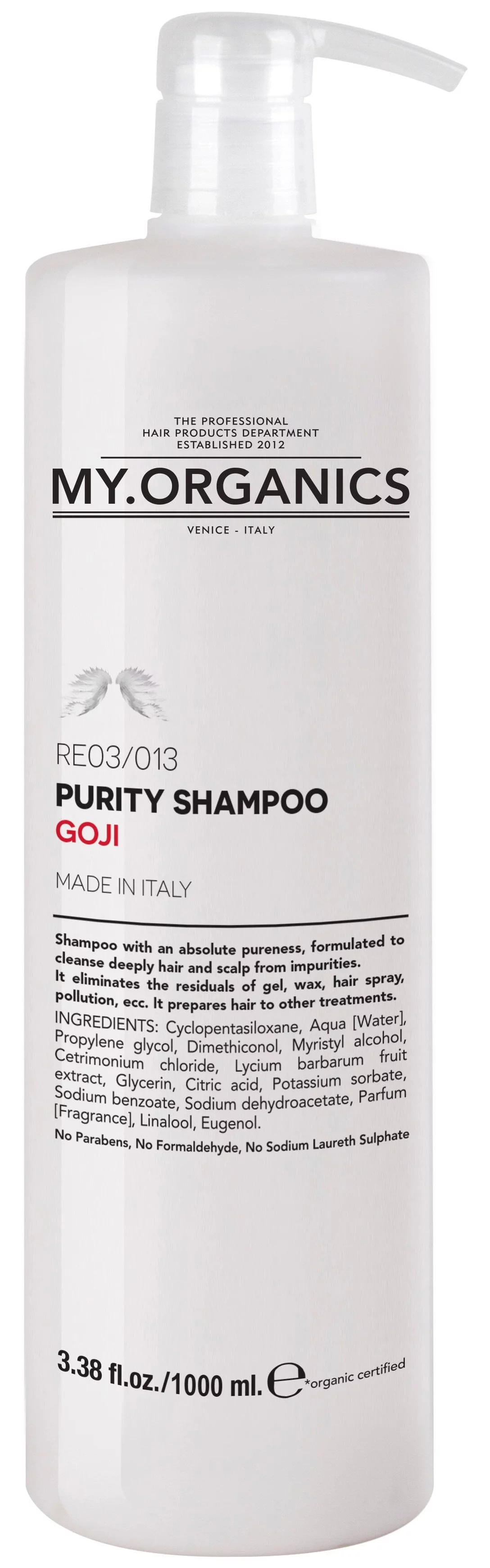 Šampon s absolutní čistotou MY.ORGANICS Purity Shampoo Goji určený pro hluboké čištění vlasů a pokožky hlavy od nečistot. Odstraňuje zbytky gelu, vosku, spreje na vlasy, znečištění atd. Připravuje vlasy na další ošetření.