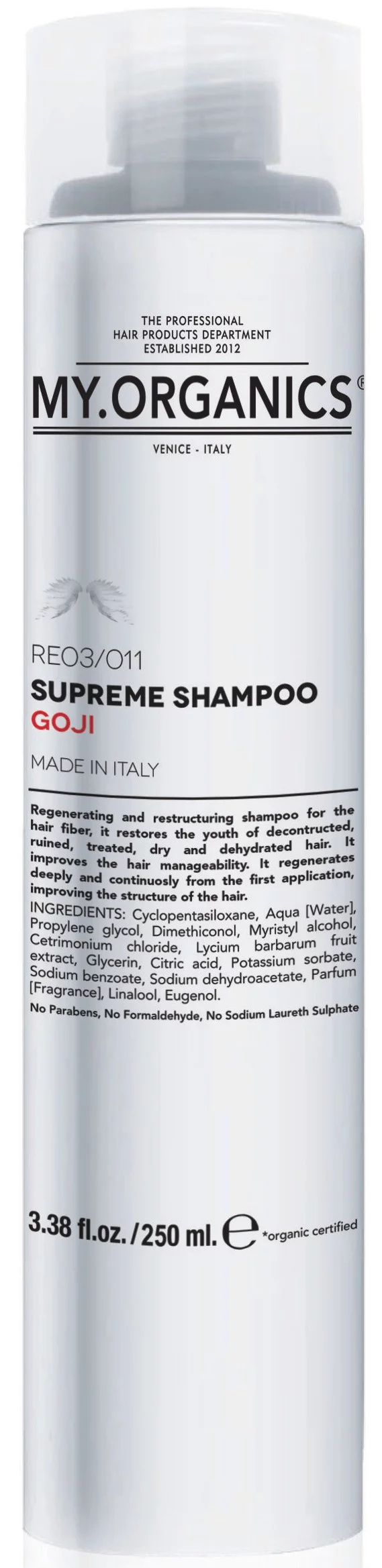 Regenerační šampon MY.ORGANICS Supreme Shampoo Goji pro rekonstrukci kapilárních vláken. Vrací původní mladistvý vzhled poškozeným, extrémně zatěžovaným, suchým, vysíleným, porézním, splihlým a dehydratovaným vlasům. Účinek šamponu spočívající v hloubkové a dlouhotrvající regeneraci je viditelný od prvních použití.