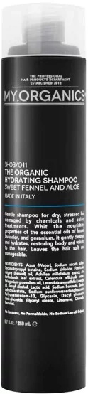 Jemný hydratační šampon MY.ORGANICS The Organic Hydrating Shampoo Sweet Fennel And Aloe vyvinutý pro suché vlasy, které jsou vyčerpané a poškozené chemickými procedurami a barvením. Díky výživným vlastnostem esenciálního oleje ze sladkého fenyklu, levandule a pelargonie jemně čistí a hydratuje vlasy, dodává jim objem a vitalitu. Po umytí jsou vlasy hebké a snadno upravitelné.