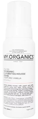 Stylingová hydratační pěna se silnou fixací MY.ORGANICS The Organic My Hydrating Mousse Strong Yogurt And Vanilla na bázi jogurtu a vanilky, ideální pro všechny typy vlasů. Dodává objem a zářivý lesk vlasům, které hloubkově hydratuje a vyživuje. Při aplikaci před foukáním vlasů vytváří ochrannou bariéru na povrchu vlasů a chrání je tak před účinkem horkého vzduchu, aniž by zanechávala zbytky, a pomáhá fixovat účes. Díky své středně silné fixační schopnosti je vhodná pro všechny typy účesů, včetně účesů s natáčkami.