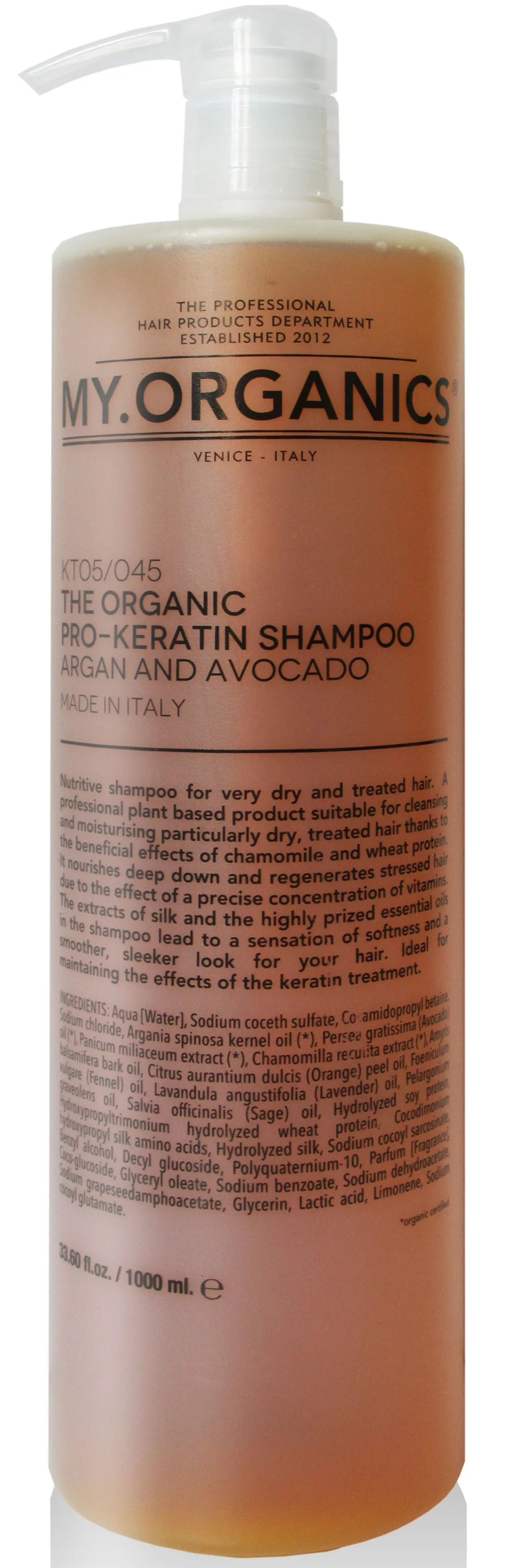 Vyživující šampon MY.ORGANICS The Organic Pro-Keratin Shampoo Argan And Avocado pro velmi suché a chemicky poškozené vlasy. Produkt pro profesionální použití, na rostlinné bázi, vhodný pro mytí a hydrataci všech mimořádně suchých a chemicky poškozených vlasů díky blahodárným účinkům heřmánku a proteinů pšenice. Díky vyvážené koncentraci vitamínů zajišťuje hloubkovou výživu a regeneraci vystresovaných vlasů. Výtažky z hedvábí a hodnotné esenciální oleje, které jsou v šamponu obsaženy, dodávají pocit hebkosti a hladší, sametovější vzhled Vašim vlasům. Ideální produkt pro prodloužení účinku keratinové kúry.