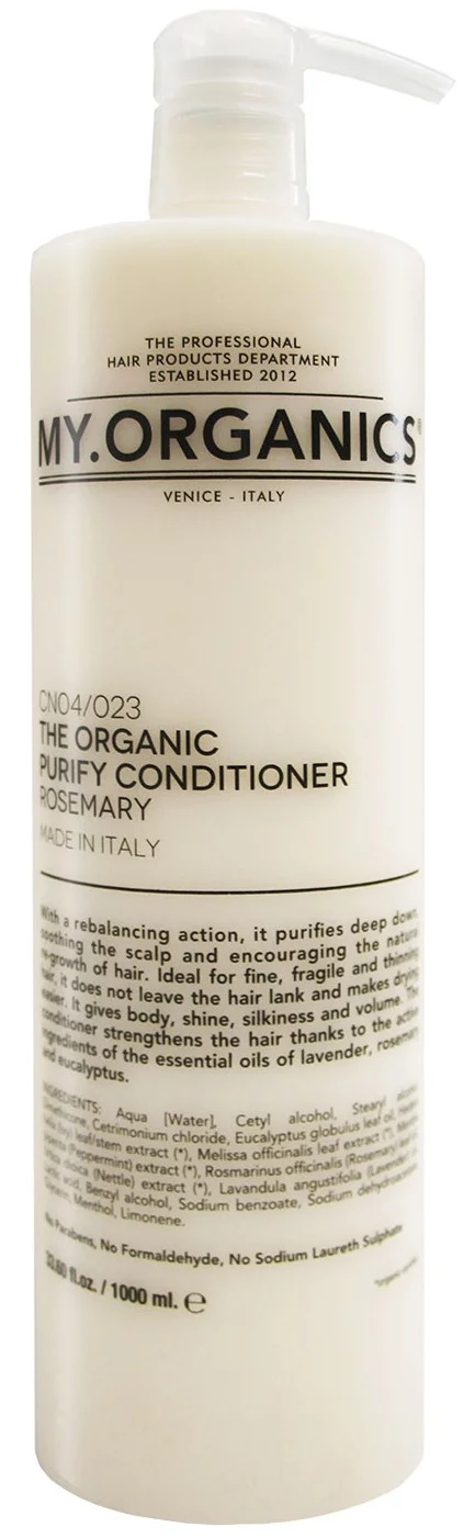 Kondicionér pro znovunastolení rovnováhy MY.ORGANICS The Organic Purify Conditioner Rosemary působí do hloubky, současně zklidňuje vlasovou pokožku a podporuje přirozený růst vlasů. Vyvinutý speciálně pro jemné, poškozené a vysílené vlasy, nezatěžuje a usnadňuje fázi sušení. Dodává objem, lesk, hedvábnost a tvar účesu. Posiluje vlasy díky aktivním složkám obsaženým v esenciálních olejích levandule, rozmarýnu a eukalyptu.