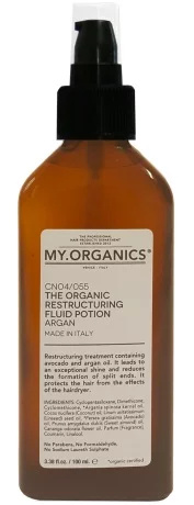 Vlasový elixír pro rekonstrukci MY.ORGANICS The Organic Restructuring Fluid Potion Argan obsahující avokádo a arganový olej. Dodává mimořádnou zářivost a pomáhá předcházet třepení konečků. Chrání vlasy před účinky horkého vzduchu při fénování. Vynikající rovněž jako masážní olej.