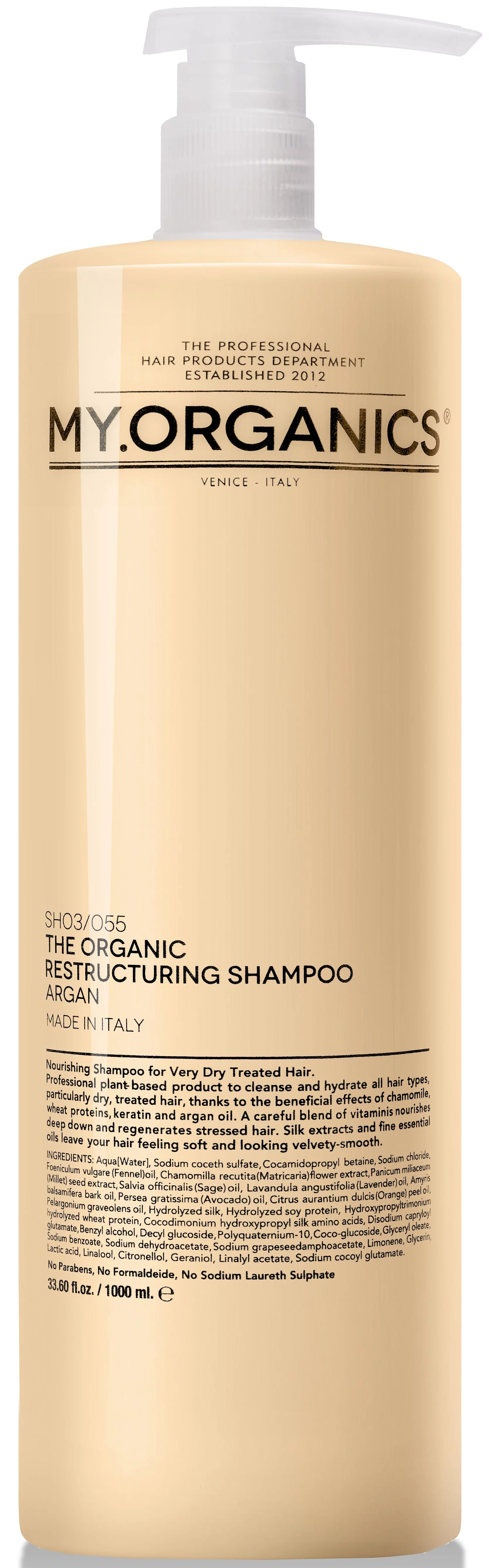 Výživný šampon MY.ORGANICS The Organic Restructuring Shampoo Argan pro velmi suché a chemicky poškozené vlasy. Šampon pro profesionální použití na rostlinné bázi, určený na mytí a hydrataci všech typů extrémně suchých a chemicky poškozených vlasů, k čemuž využívá blahodárných účinků heřmánku a proteinů pšenice. Díky přesně vyvážené koncentraci vitamínů hloubkově vyživuje a regeneruje stresované vlasy. Obsahuje výtažky z hedvábí a hodnotné esenciální oleje, které dodávají pocit měkkosti a hladší, hedvábnější vzhled Vašich vlasů.