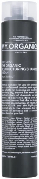 Výživný šampon MY.ORGANICS The Organic Restructuring Shampoo Argan pro velmi suché a chemicky poškozené vlasy. Šampon pro profesionální použití na rostlinné bázi, určený na mytí a hydrataci všech typů extrémně suchých a chemicky poškozených vlasů, k čemuž využívá blahodárných účinků heřmánku a proteinů pšenice. Díky přesně vyvážené koncentraci vitamínů hloubkově vyživuje a regeneruje stresované vlasy. Obsahuje výtažky z hedvábí a hodnotné esenciální oleje, které dodávají pocit měkkosti a hladší, hedvábnější vzhled Vašich vlasů.