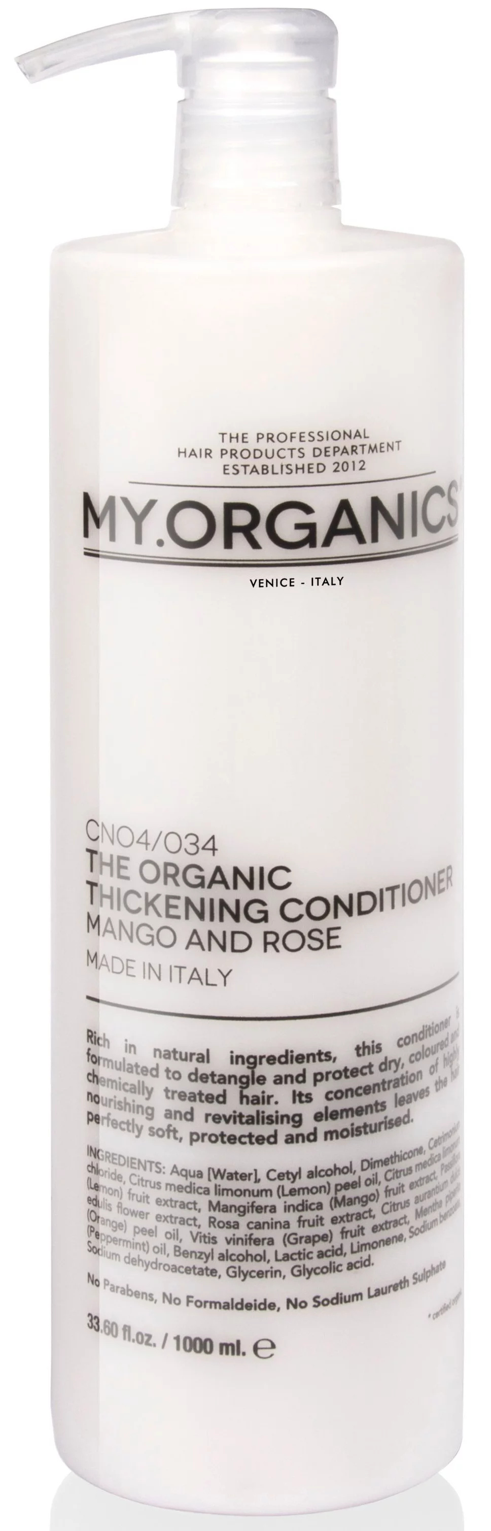 Posilující kondicionér My.Organics The Organic Thickening Conditioner Mango And Rose bohatý na přírodní ingredience, vyvinutý pro ošetřování a ochranu suchých vlasů, barvených vlasů a vlasů po chemických úpravách.