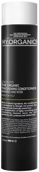 Posilující kondicionér My.Organics The Organic Thickening Conditioner Mango And Rose bohatý na přírodní ingredience, vyvinutý pro ošetřování a ochranu suchých vlasů, barvených vlasů a vlasů po chemických úpravách.